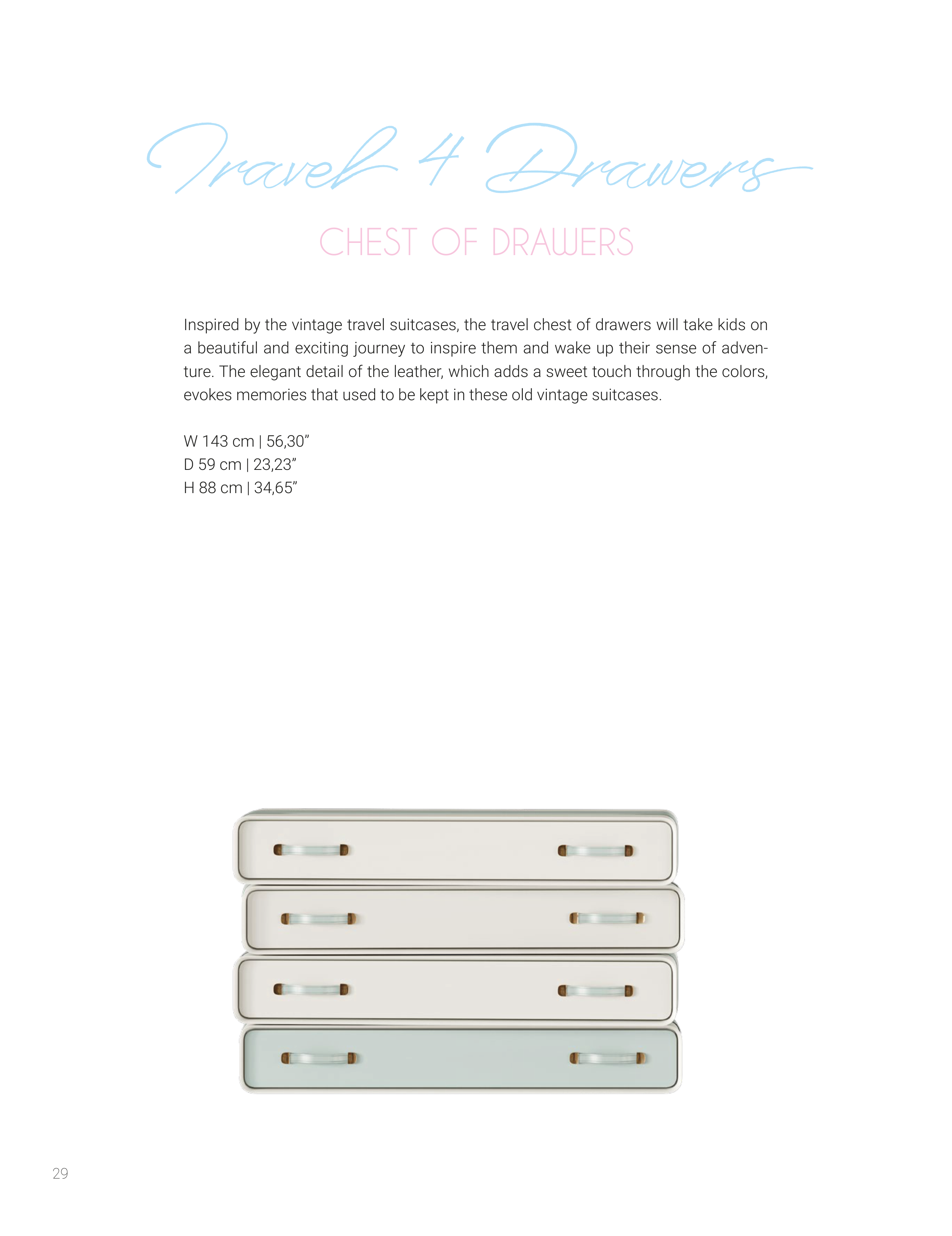 Inspired by the vintage travel suitcases, the travel chest of drawers will take kids on