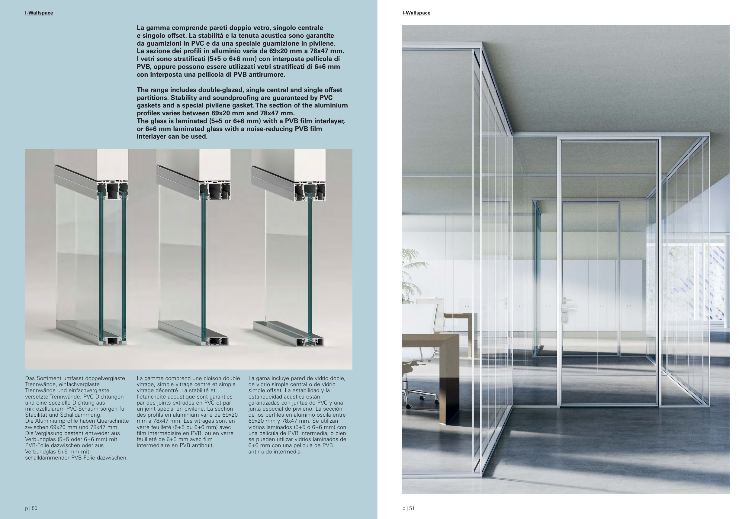 La gamma comprende pareti doppio vetro, singolo centrale
