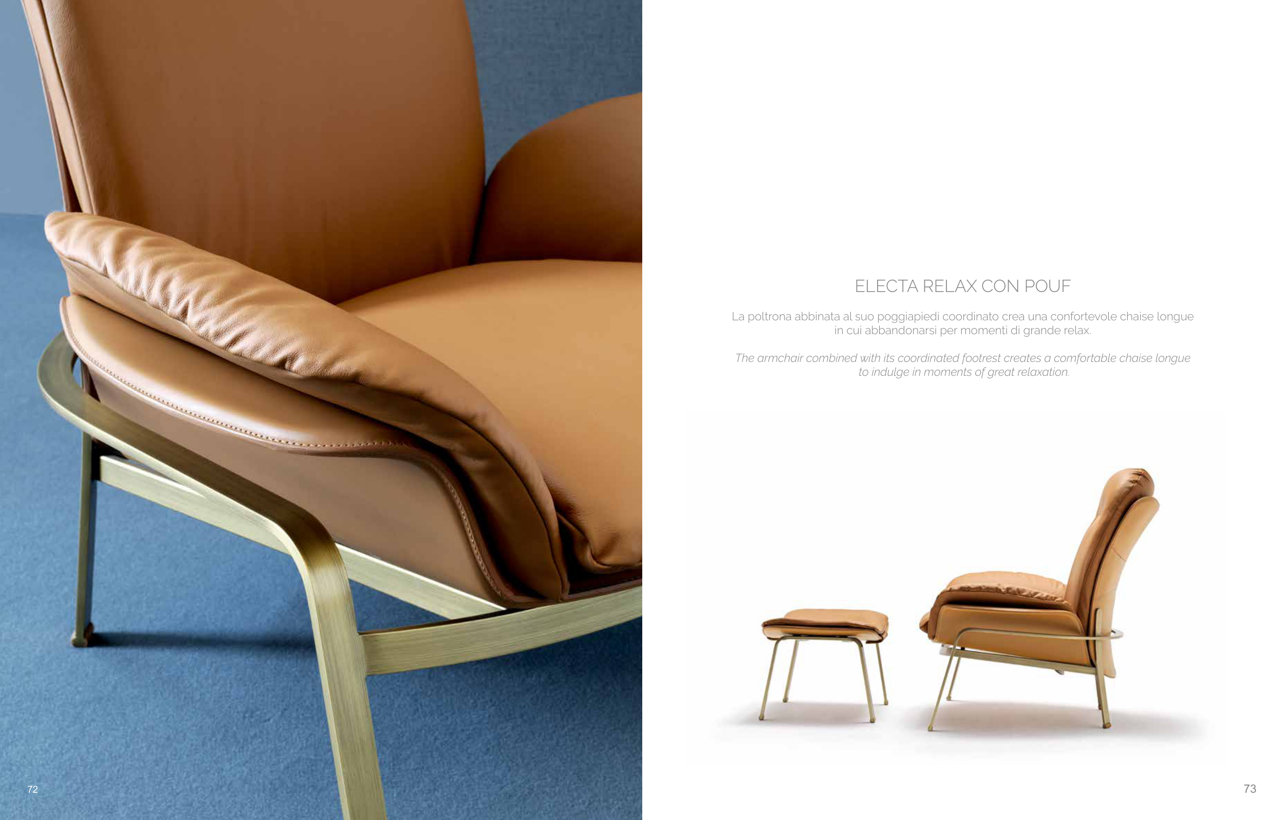 The armchair combined with its coordinated footrest creates a comfortable chaise longue
