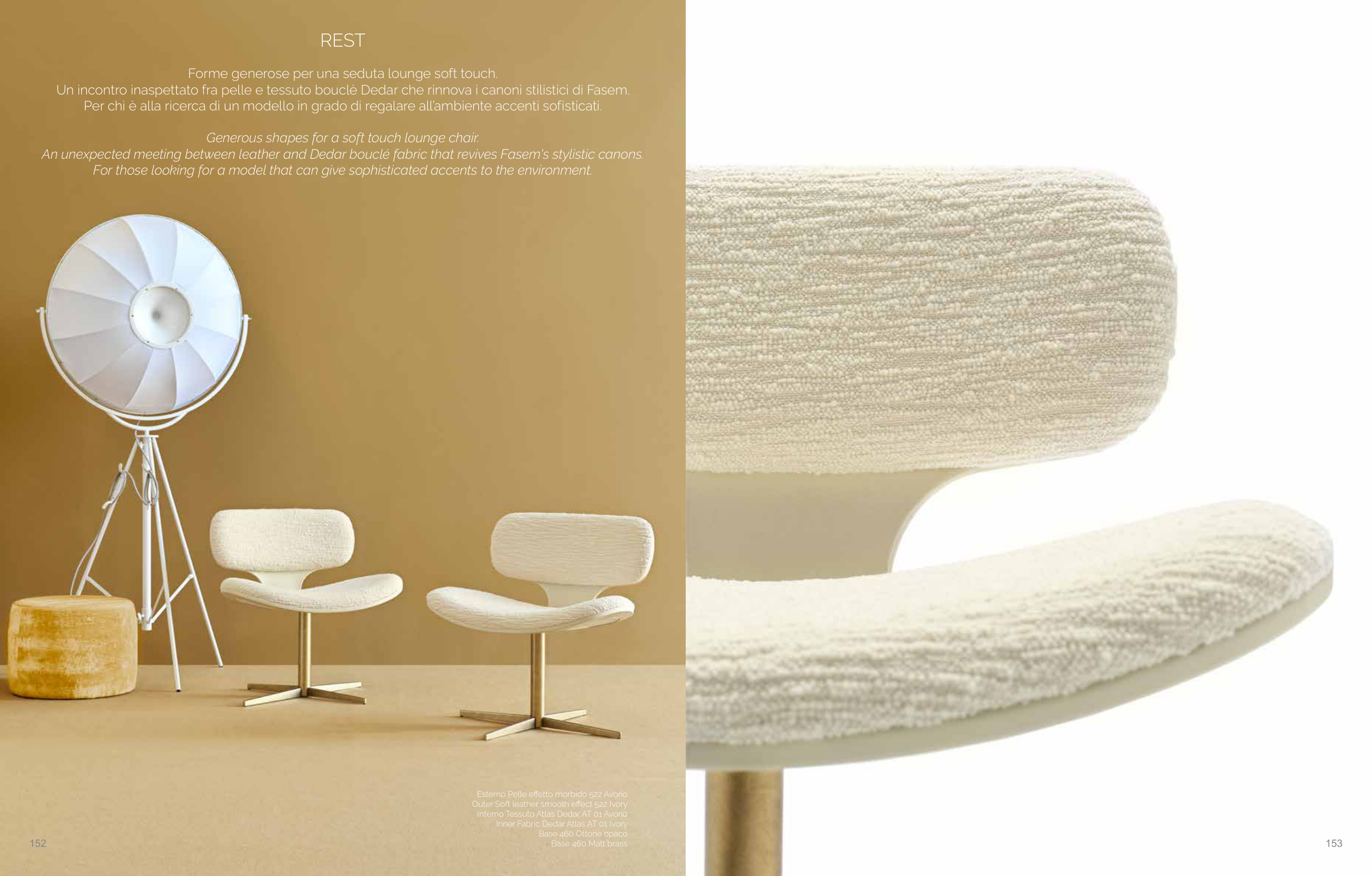 An unexpected meeting between leather and Dedar bouclé fabric that revives Fasem's stylistic canons.