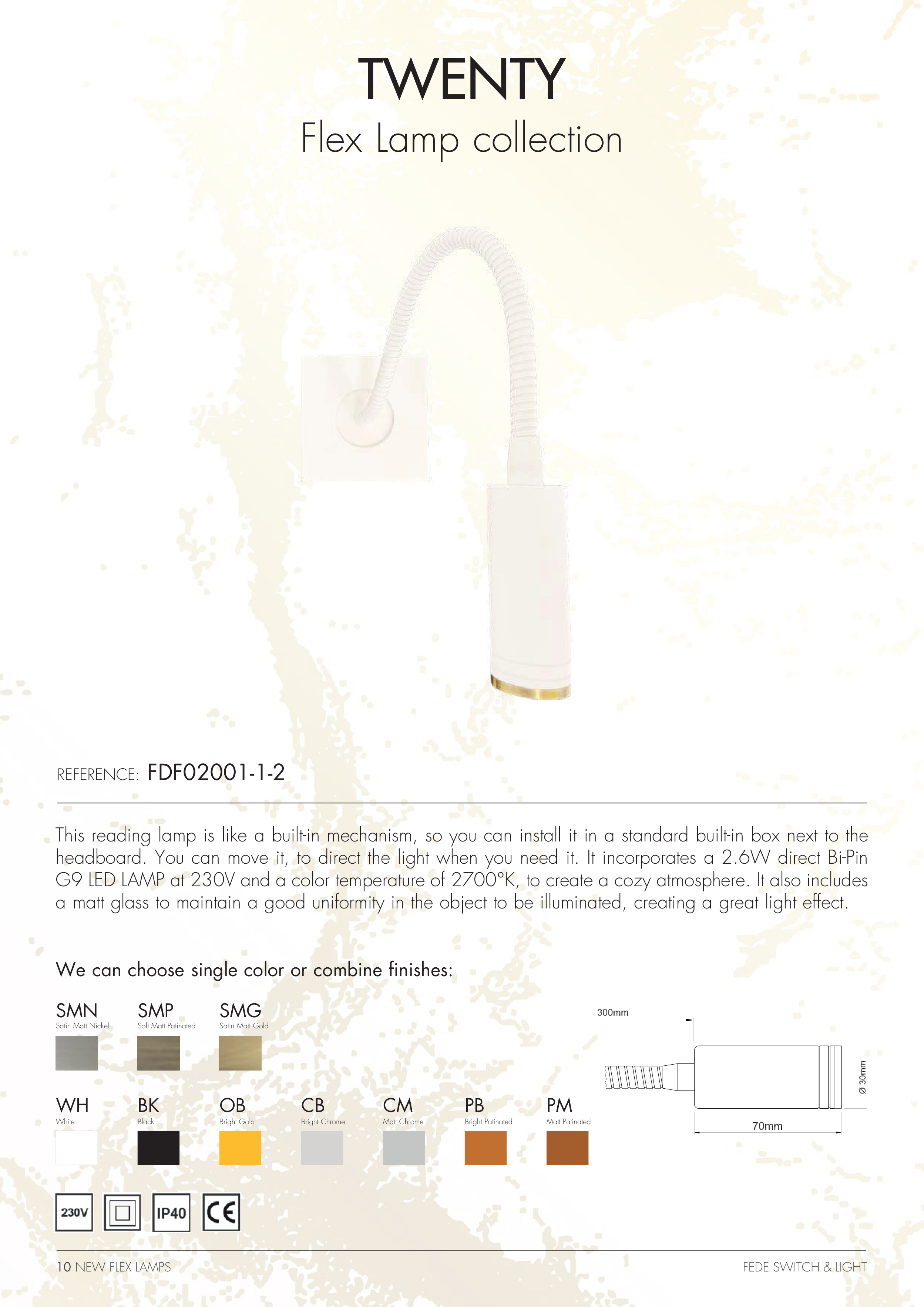 G9 LED LAMP at 230V and a color temperature of 2700°K, to create a cozy atmosphere. It also includes