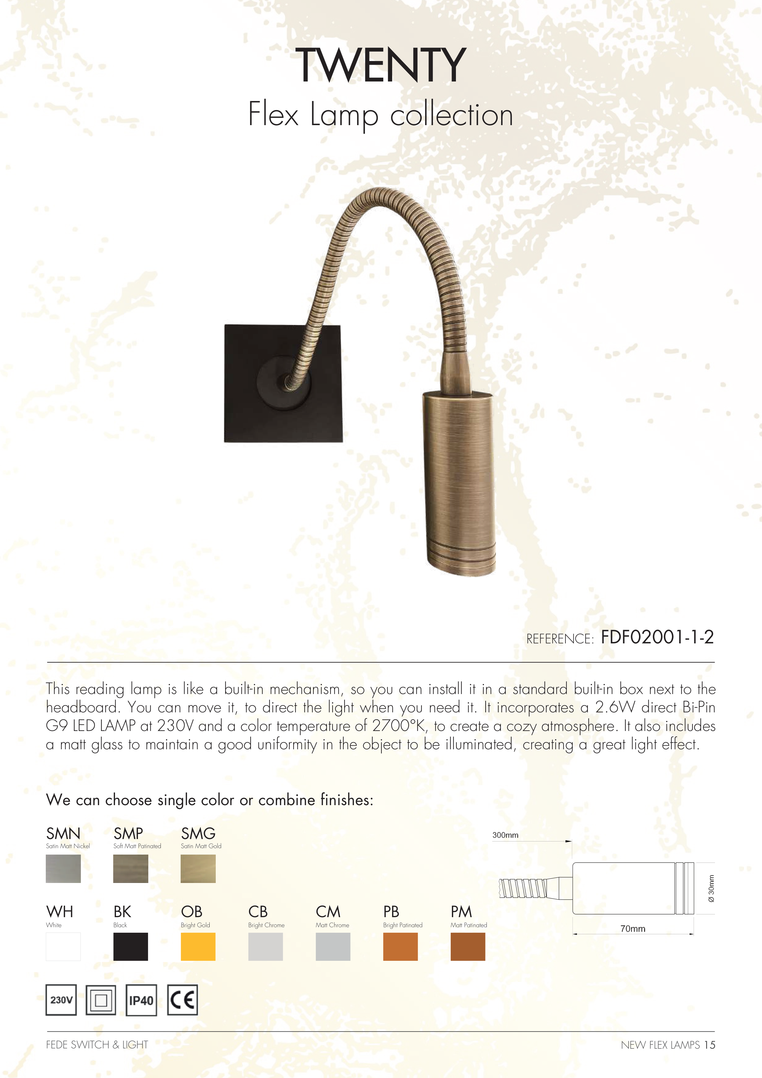 G9 LED LAMP at 230V and a color temperature of 2700°K, to create a cozy atmosphere. It also includes