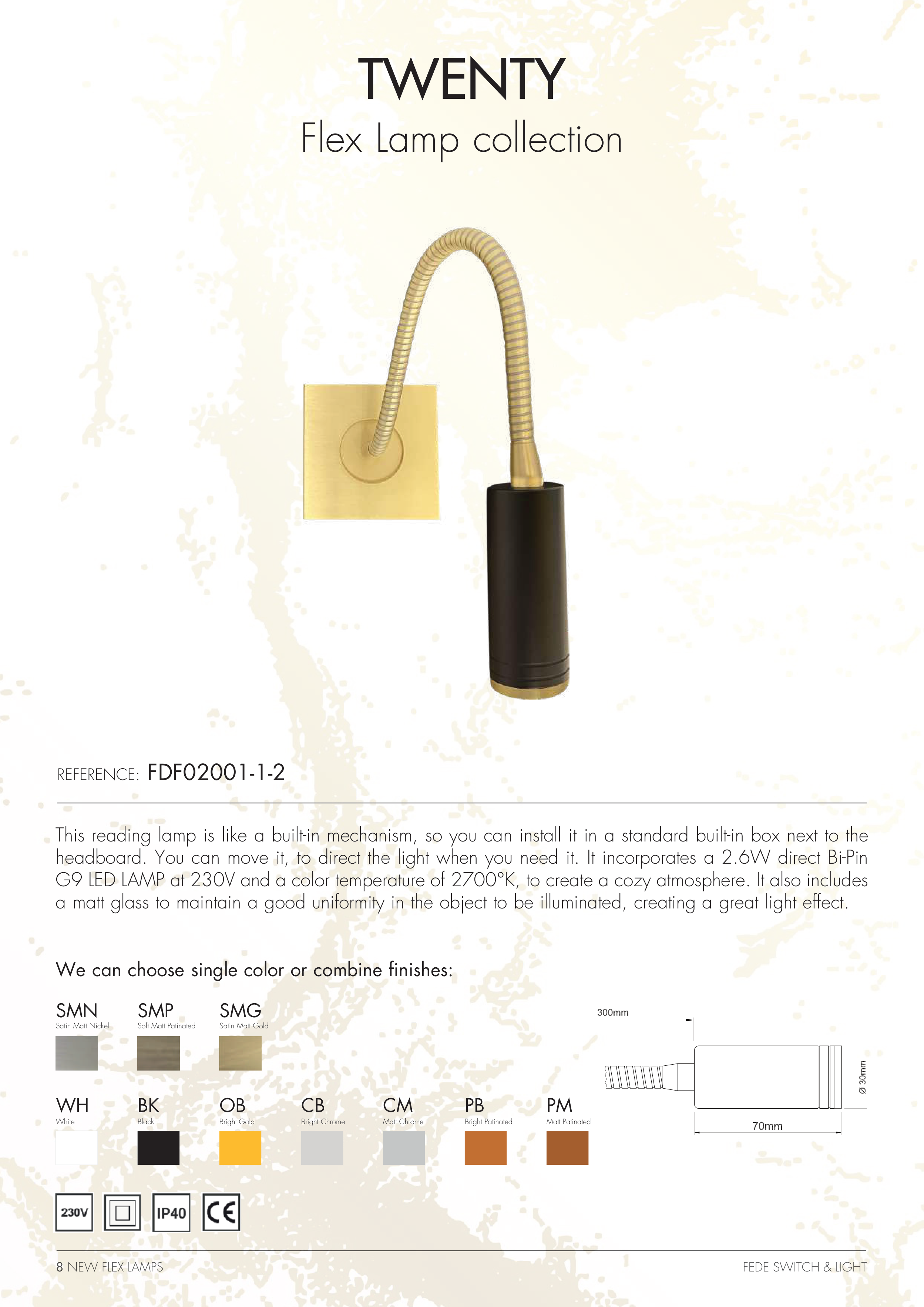 G9 LED LAMP at 230V and a color temperature of 2700°K, to create a cozy atmosphere. It also includes