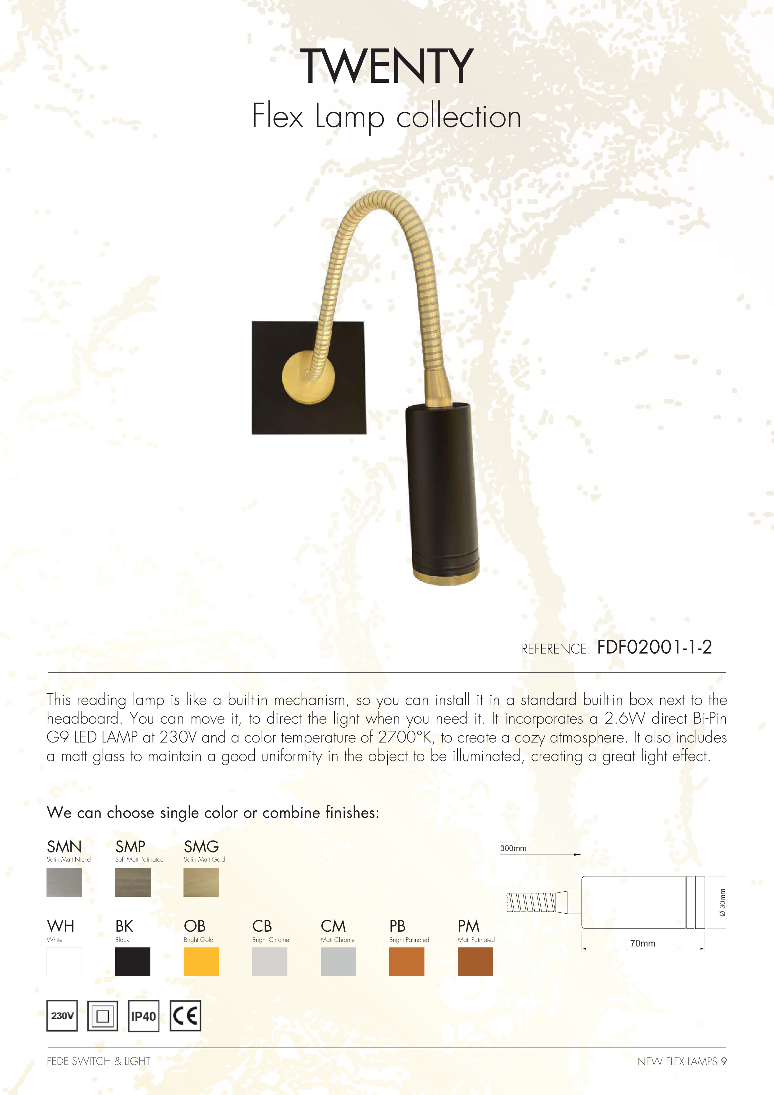 G9 LED LAMP at 230V and a color temperature of 2700°K, to create a cozy atmosphere. It also includes