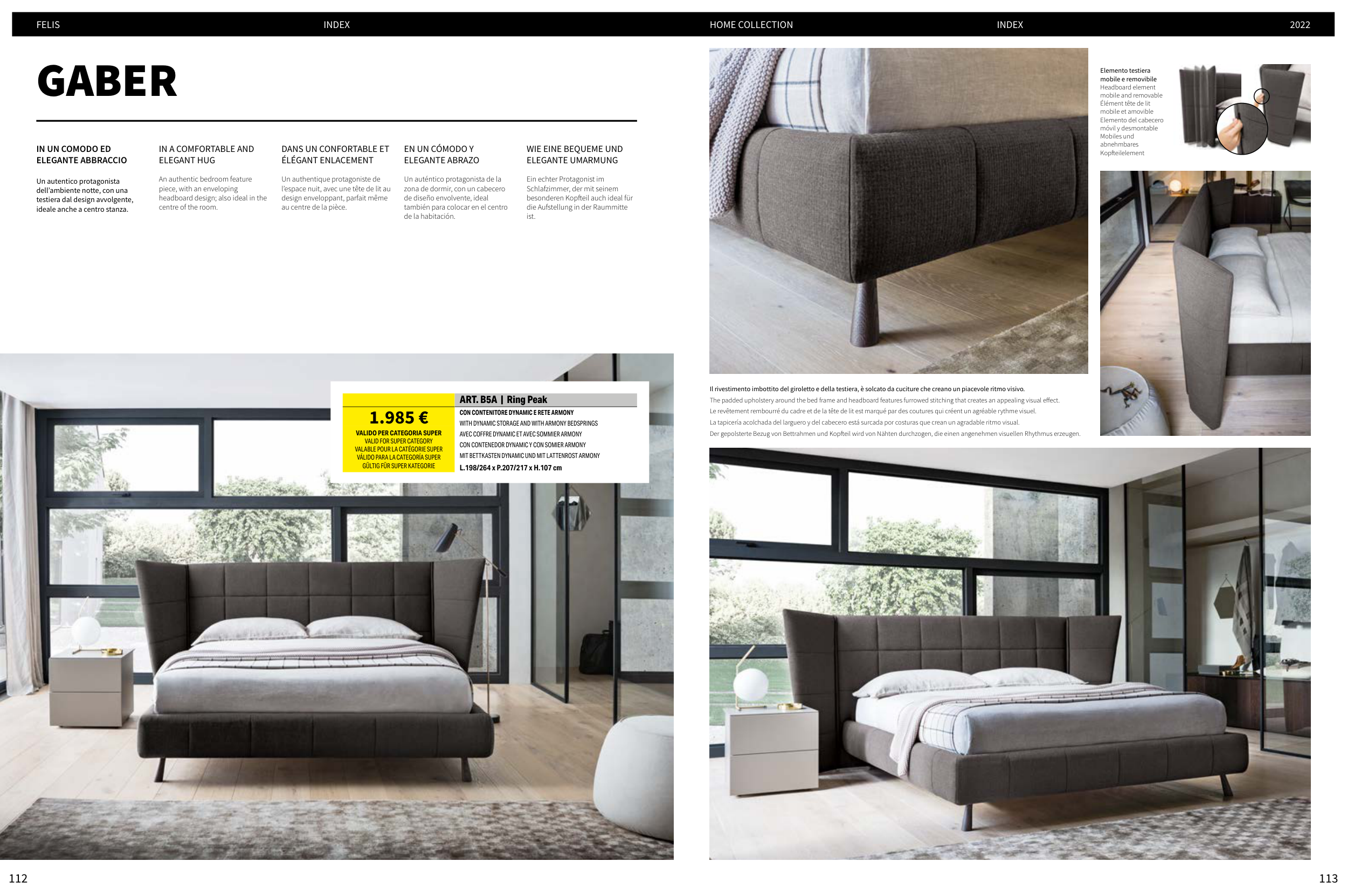Il rivestimento imbottito del giroletto e della testiera, è solcato da cuciture che creano un piacevole ritmo visivo.