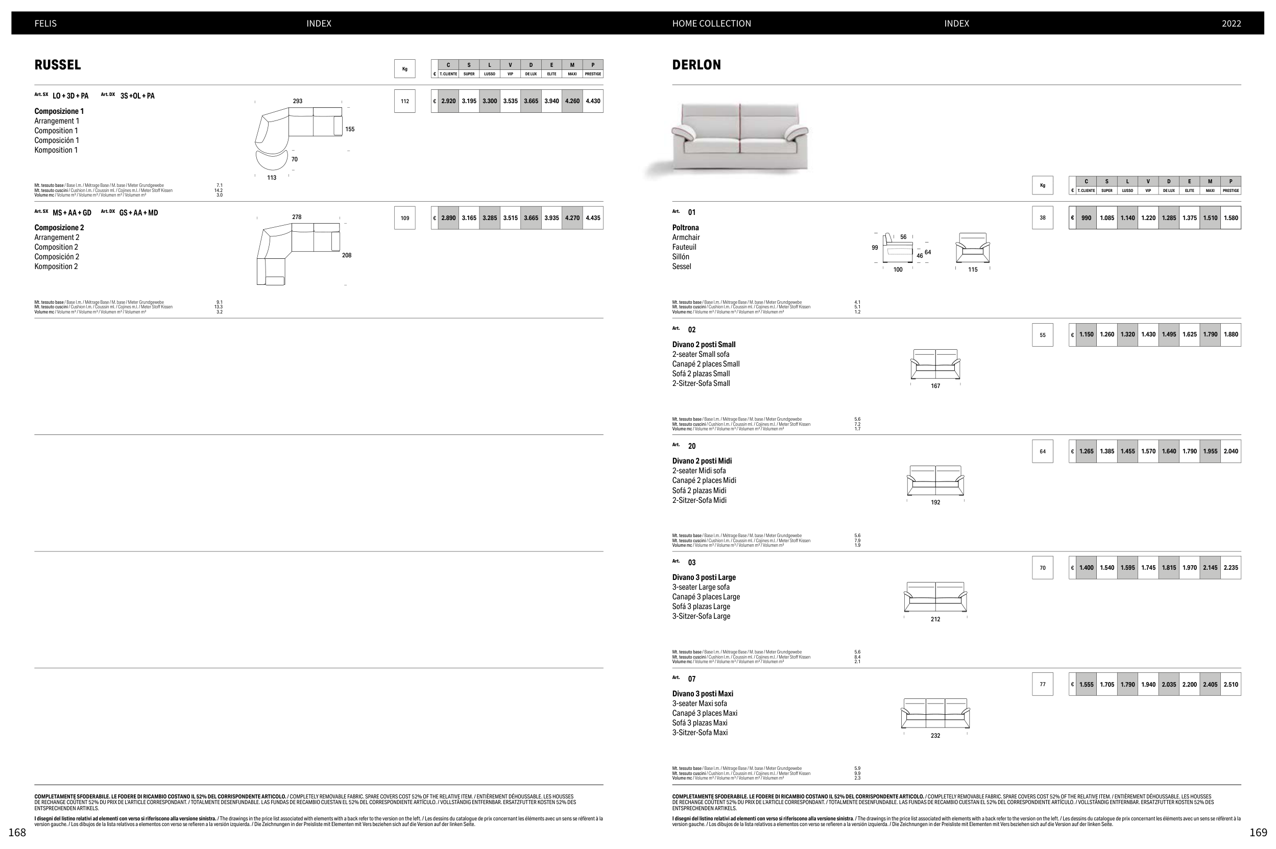 DE RECHANGE COÛTENT 52% DU PRIX DE L’ARTICLE CORRESPONDANT. / TOTALMENTE DESENFUNDABLE. LAS FUNDAS DE RECAMBIO CUESTAN EL 52% DEL CORRESPONDIENTE ARTÍCULO. / VOLLSTÄNDIG ENTFERNBAR. ERSATZFUTTER KOSTEN 52% DES