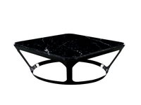 The Pierre coffee and side tables feature monolithic tops and frames fashioned in reduced thicknesses. They feature an outer metal “skin” with large open surfaces and a dark grey finish. The lightness, combined with stability, is clear in the surfaces that seem to float, with sophisticated ground details, both in satin tempered glass and precious marble.