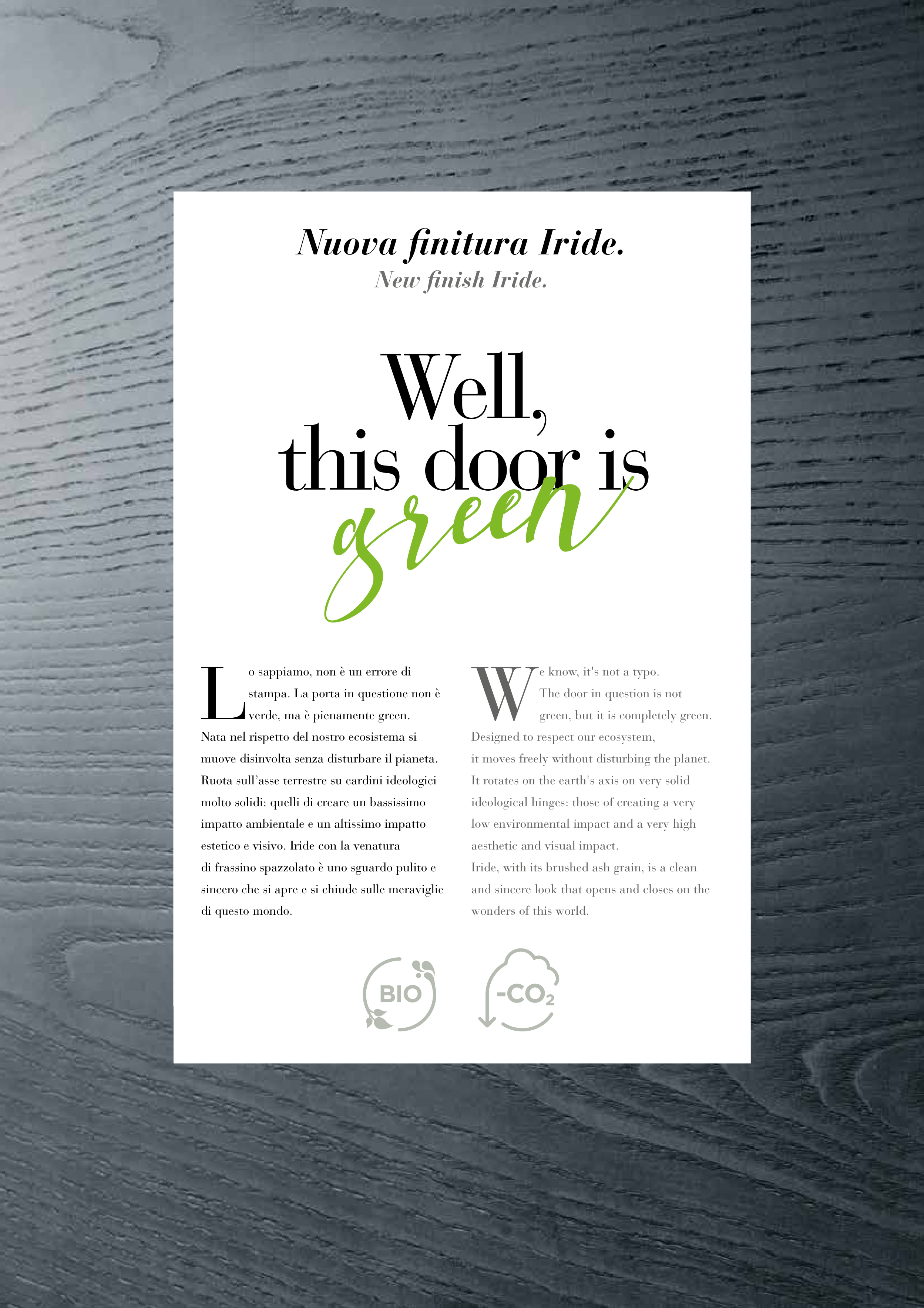 Iride, with its brushed ash grain, is a clean