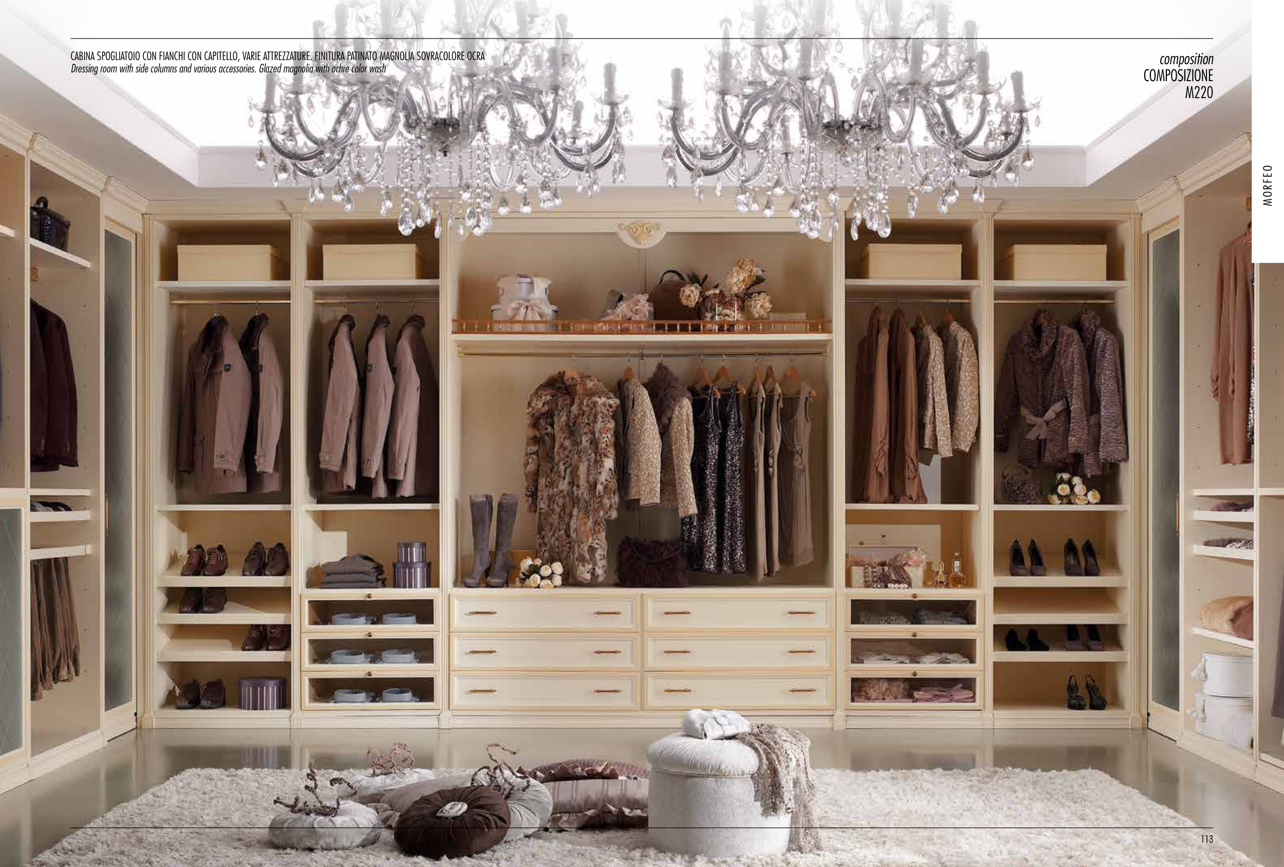 cabina spogliatoio con fianchi con capitello, varie attrezzature. finitura patinato magnolia sovracolore ocra