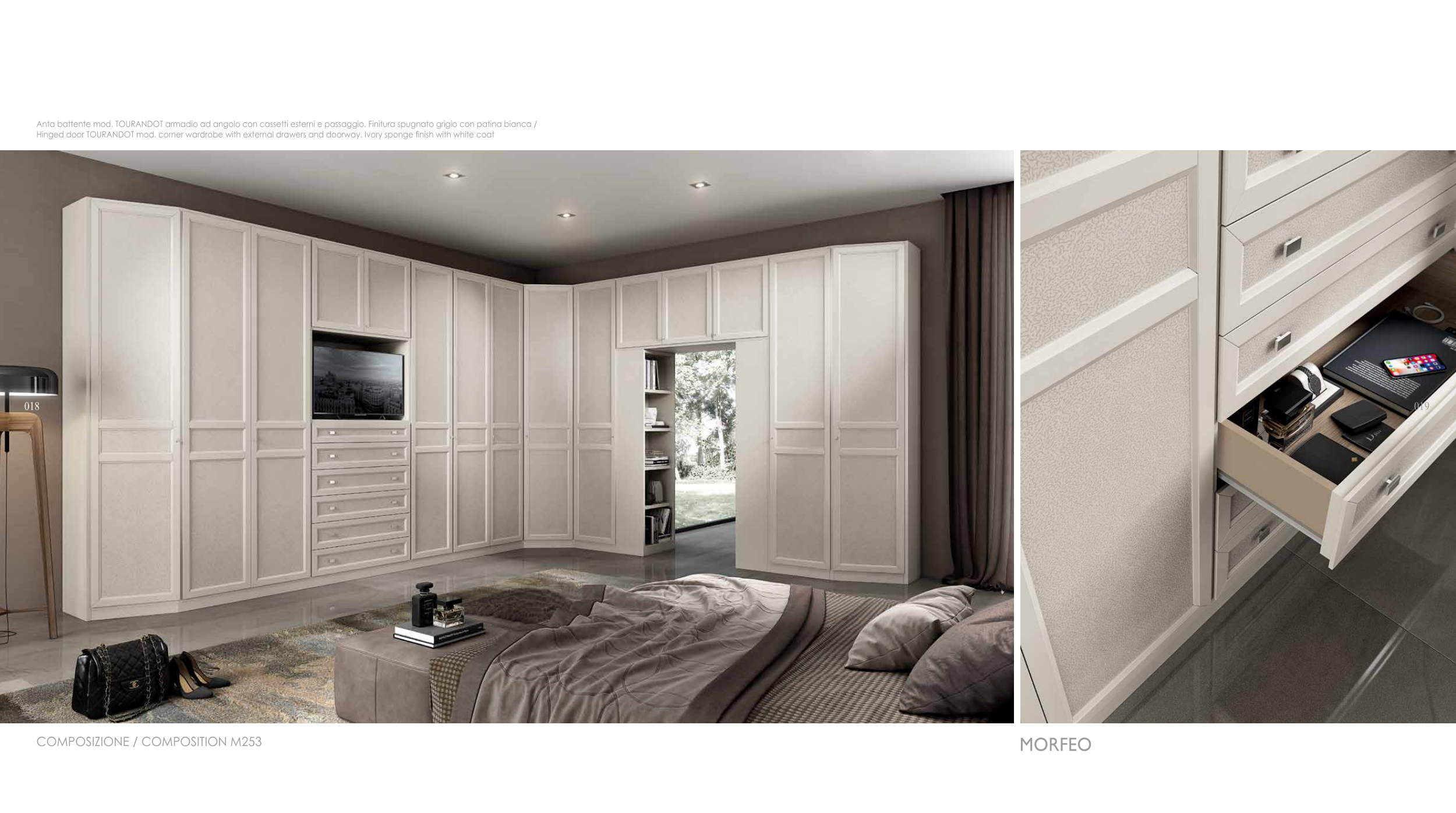 Hinged door TOURANDOT mod. corner wardrobe with external drawers and doorway. Ivory sponge finish with white coat