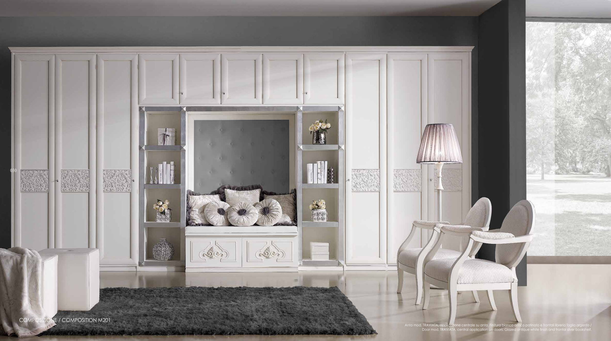 Door mod. TRAVIATA, central application on doors. Glazed antique white finish and frontal silver bookshelf.