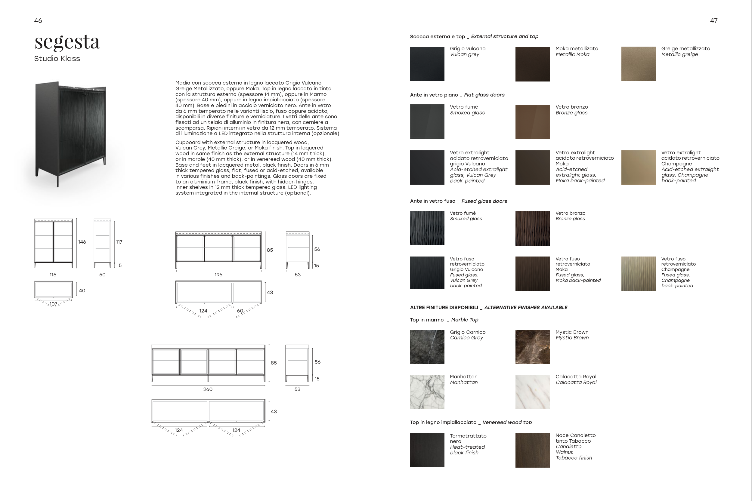 in various finishes and back-paintings. Glass doors are fixed