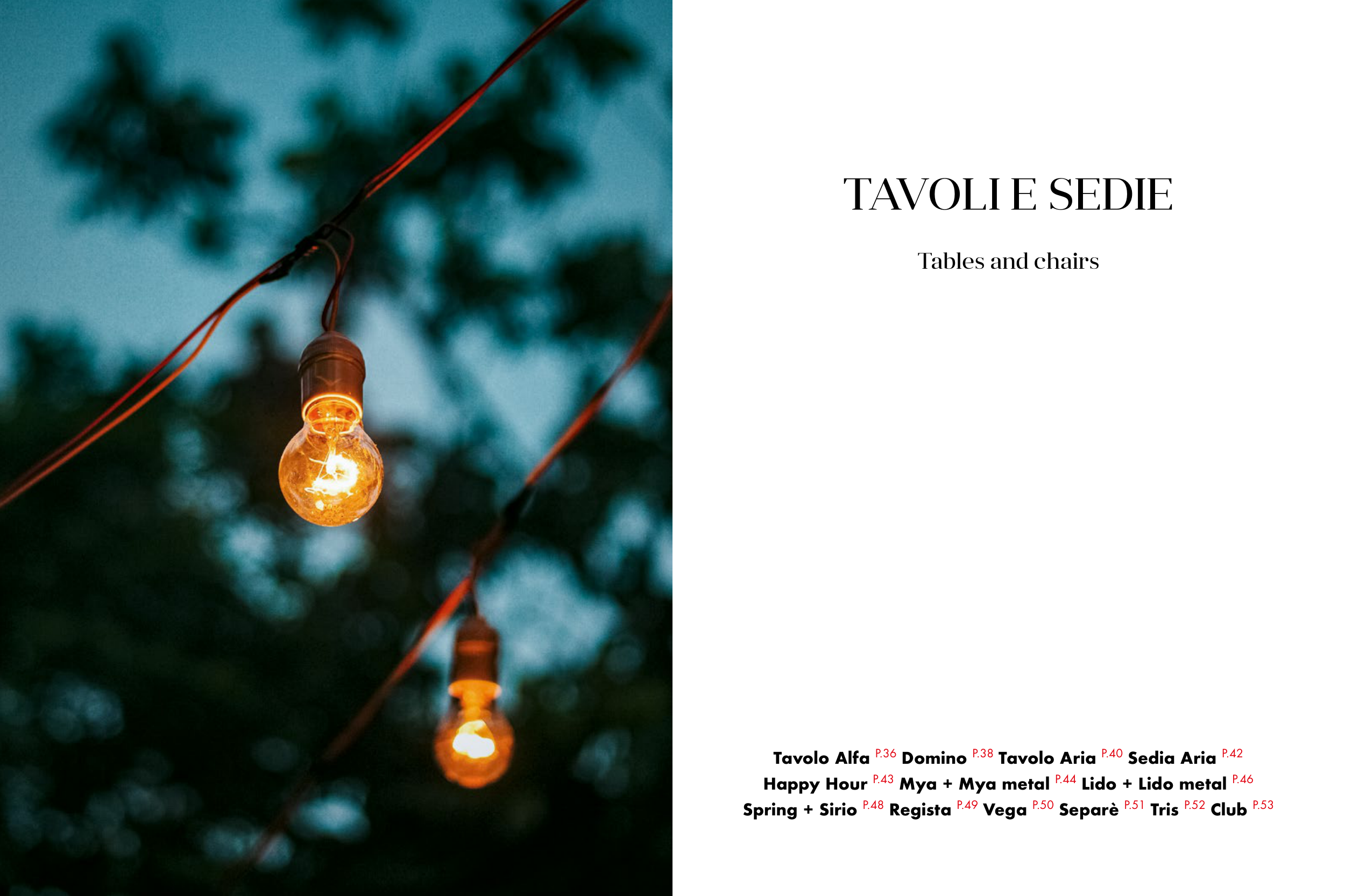 Tavolo Alfa P.36 Domino P.38 Tavolo Aria P.40 Sedia Aria P.42