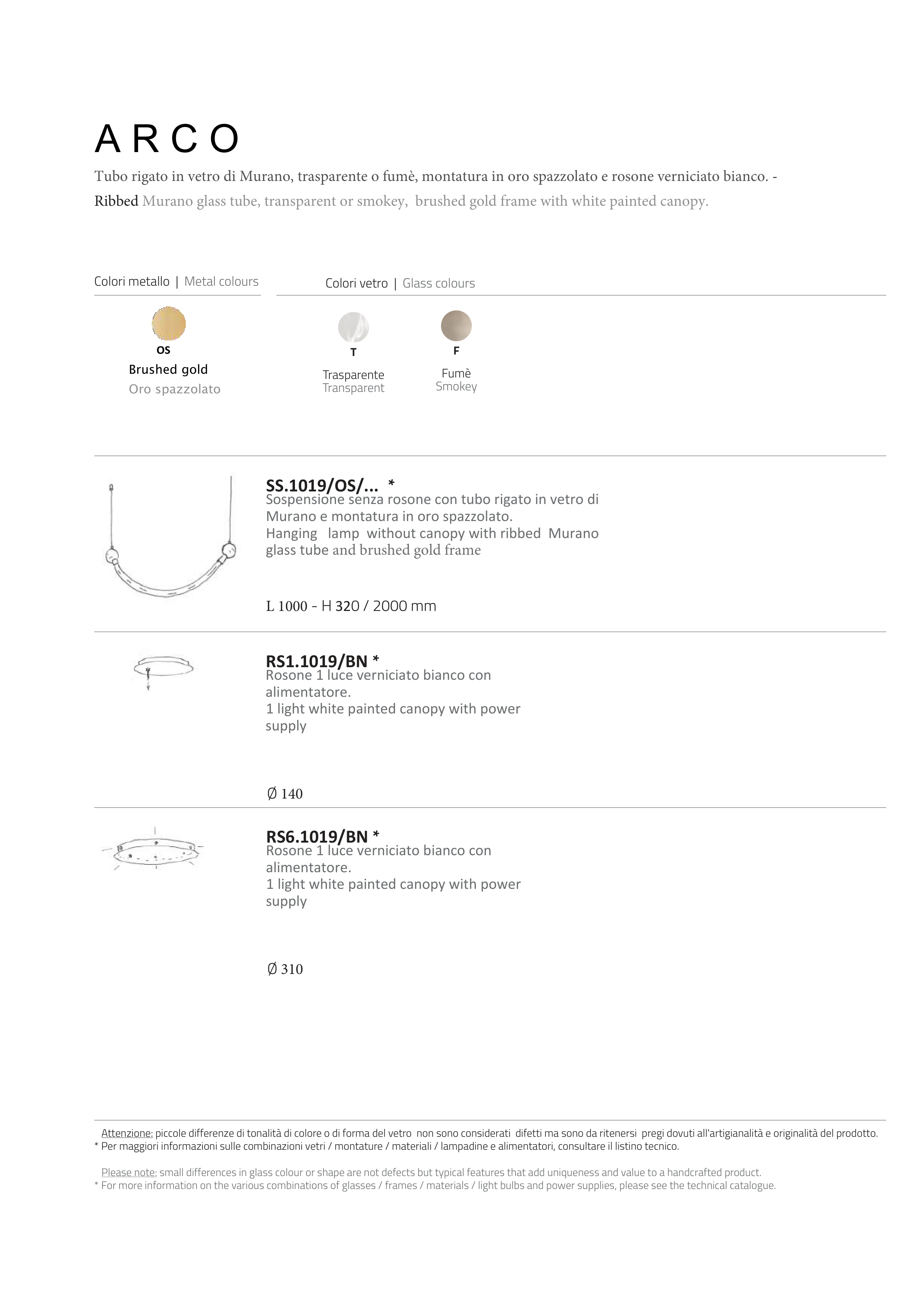 * Per maggiori informazioni sulle combinazioni vetri / montature / materiali / lampadine e alimentatori, consultare il listino tecnico.