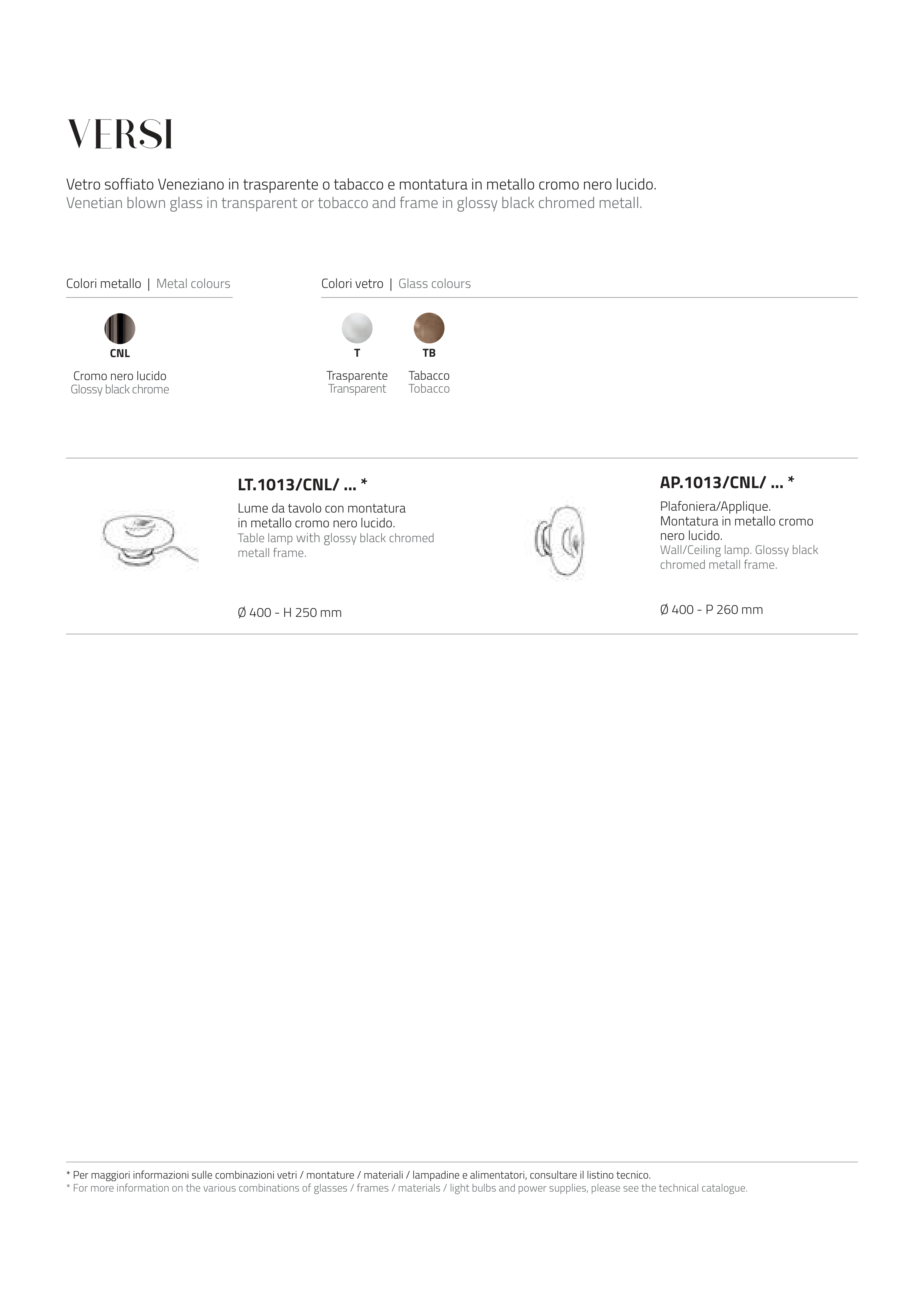 * Per maggiori informazioni sulle combinazioni vetri / montature / materiali / lampadine e alimentatori, consultare il listino tecnico.