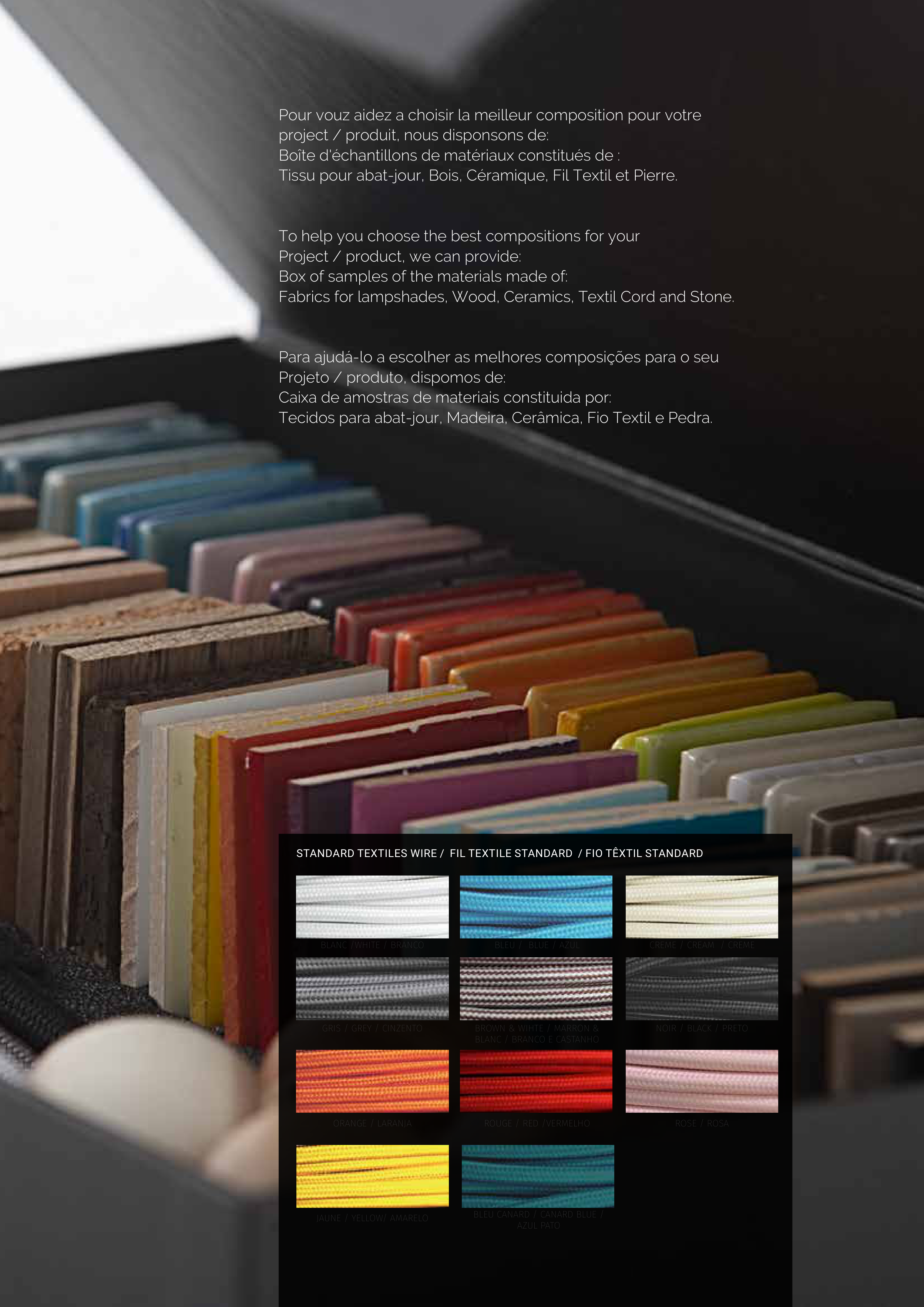 Fabrics for lampshades, Wood, Ceramics, Textil Cord and Stone.