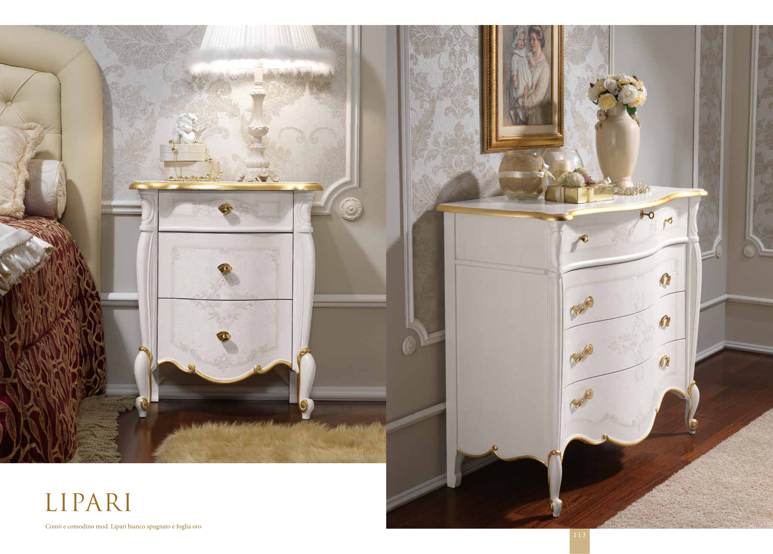 Comò e comodino mod. Lipari bianco spugnato e foglia oro