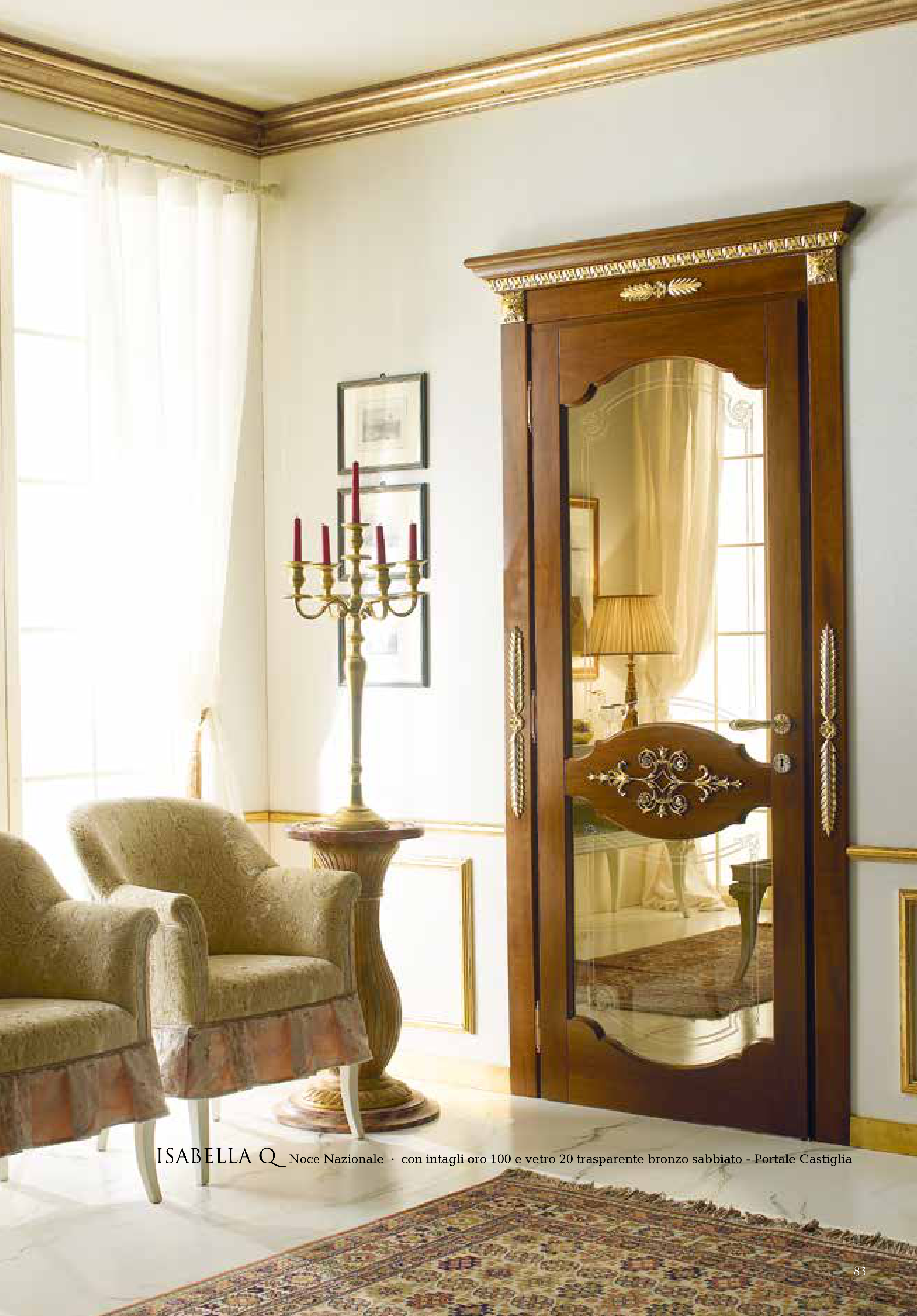 Isabella Q noce nazionale · con intagli oro 100 e vetro 20 trasparente bronzo sabbiato - Portale Castiglia