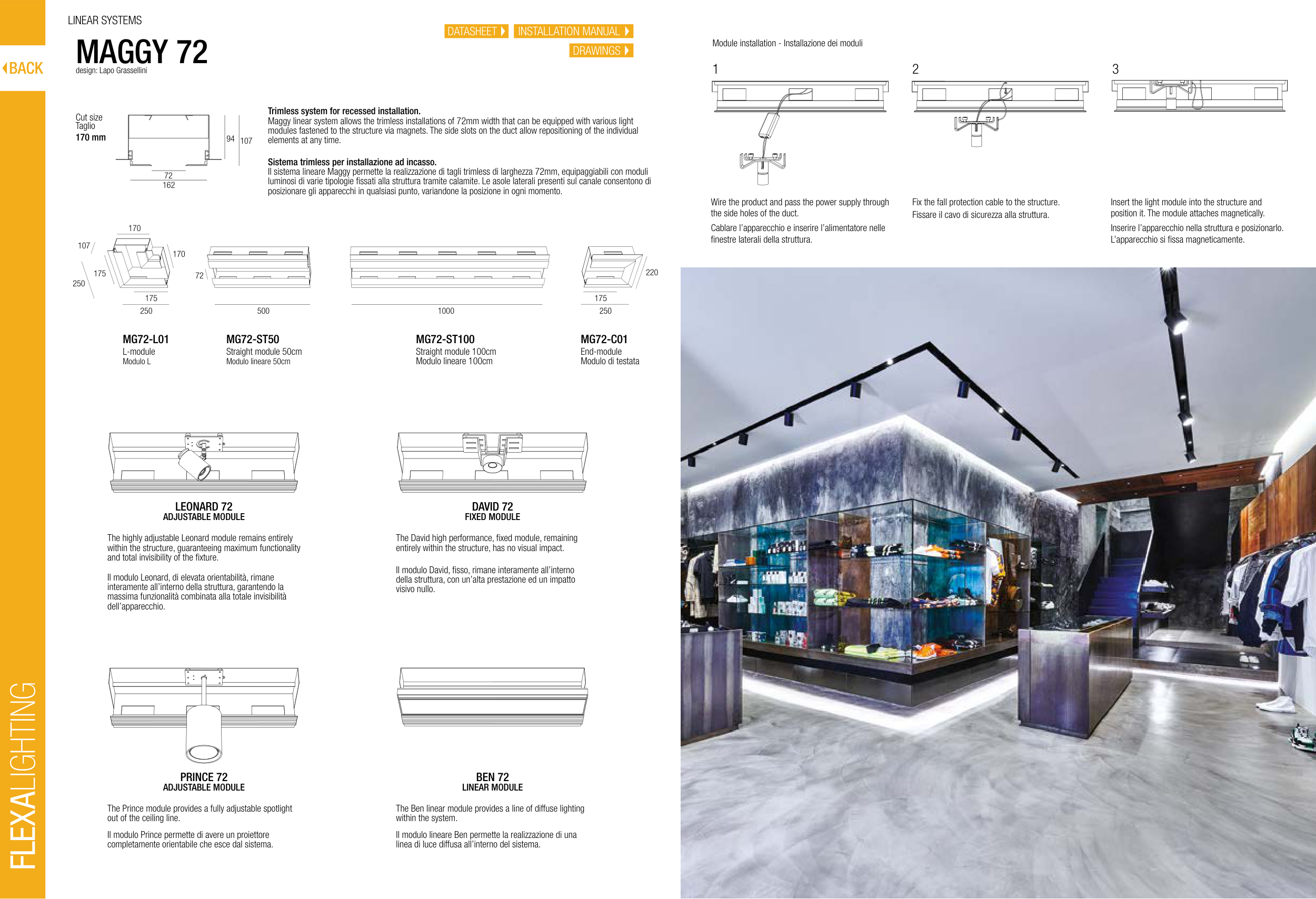 Il sistema lineare Maggy permette la realizzazione di tagli trimless di larghezza 72mm, equipaggiabili con moduli