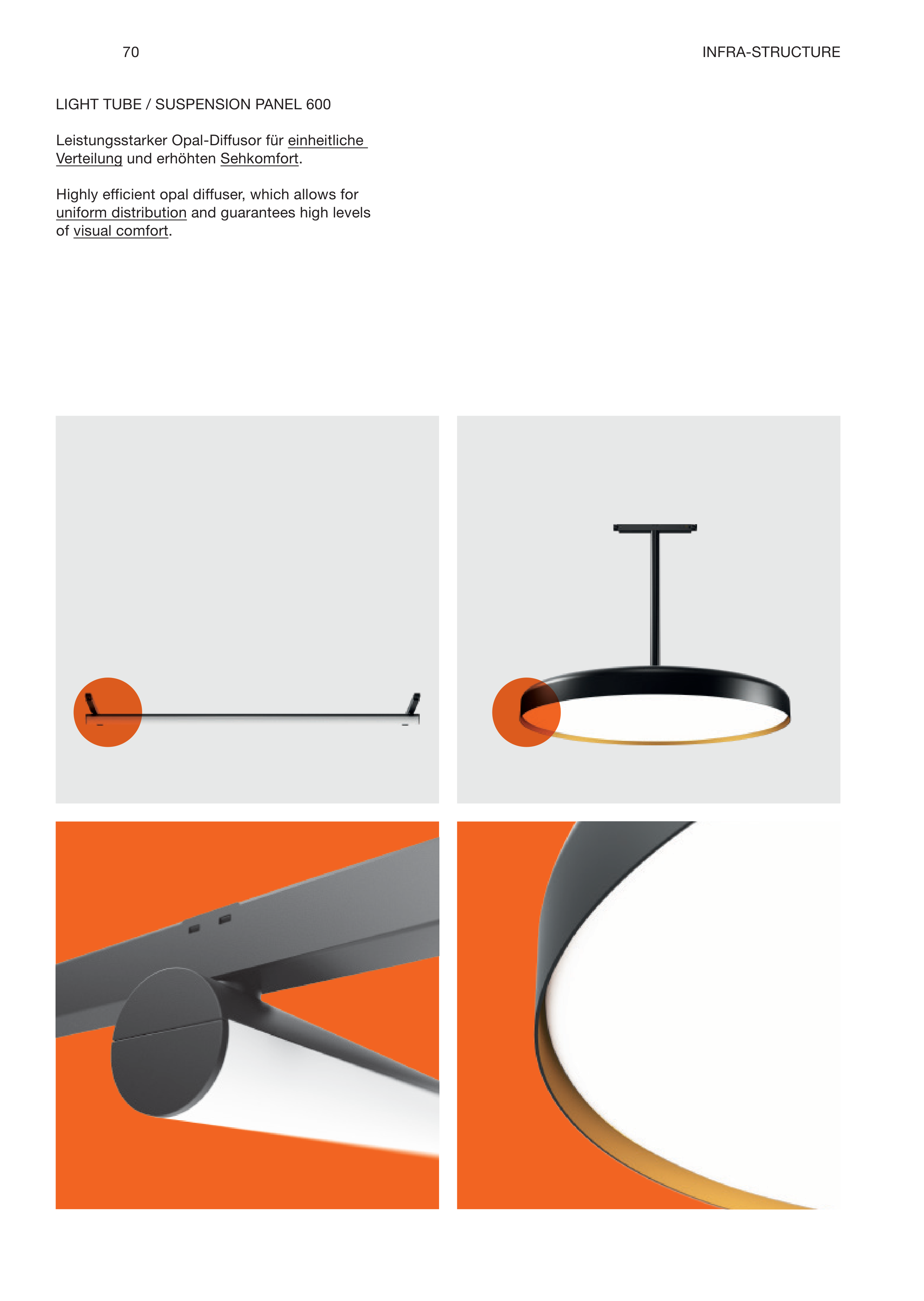 INFRA-STRUCTURE LIGHT TUBE / SUSPENSION PANEL 600 70 Leistungsstarker Opal-Diffusor für einheitliche Verteilung und erhöhten Sehkomfort. Highly efficient opal diffuser, which allows for uniform distribution and guarantees high levels of visual comfort.