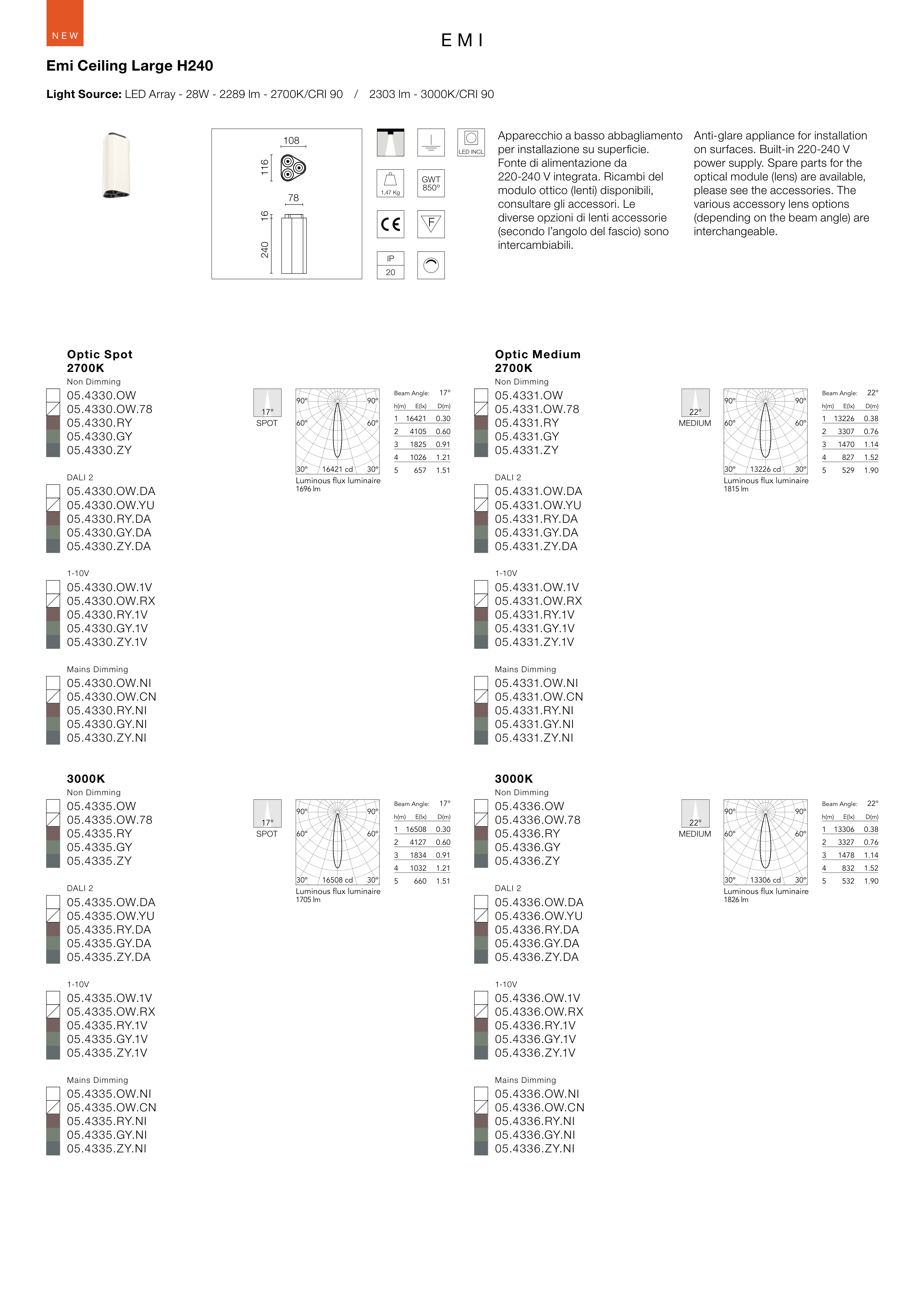 Light Source: LED Array - 28W - 2289 lm - 2700K/CRI 90 / 2303 lm - 3000K/CRI 90