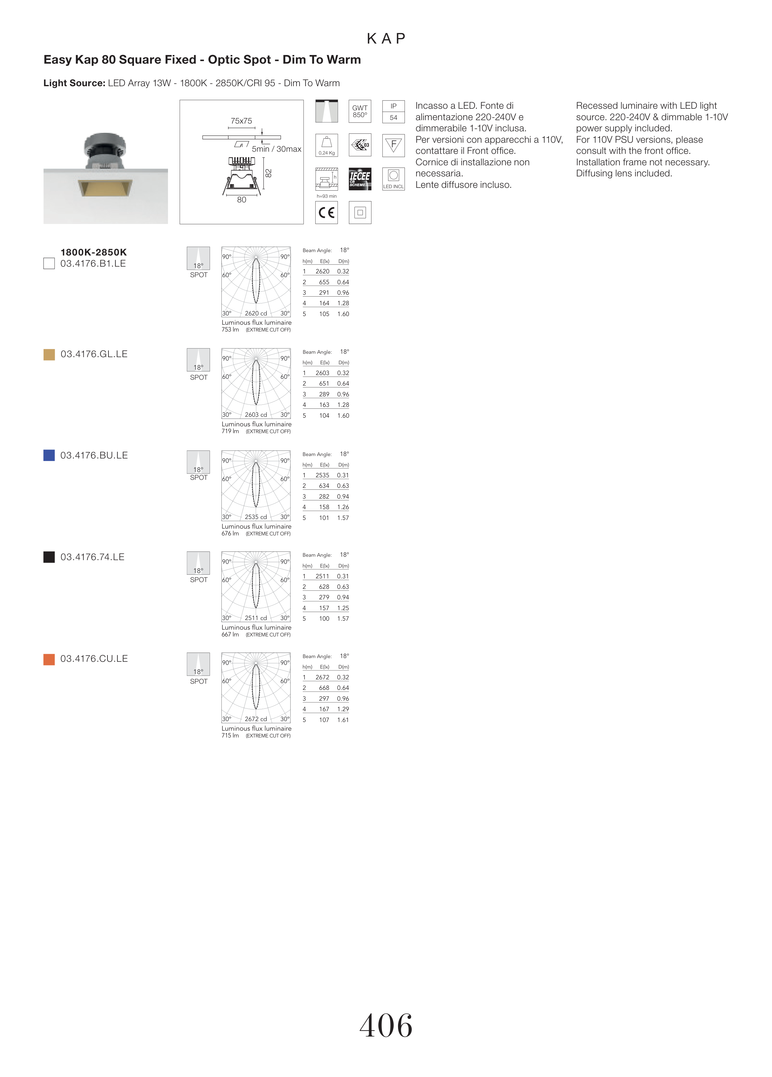 Easy Kap 80 Square Fixed - Optic Spot - Dim To Warm