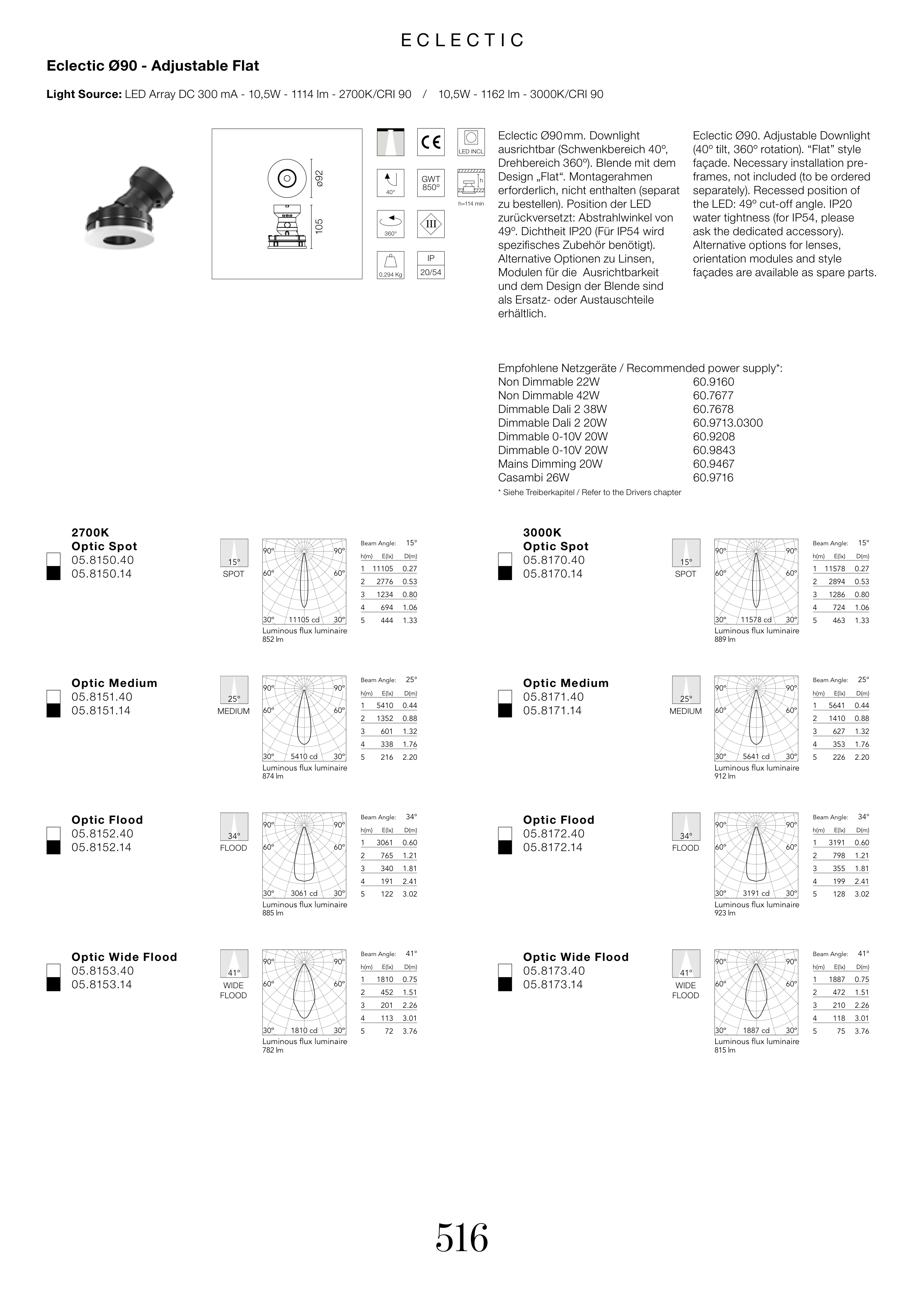 Light Source: LED Array DC 300 mA - 10,5W - 1114 lm - 2700K/CRI 90 / 10,5W - 1162 lm - 3000K/CRI 90