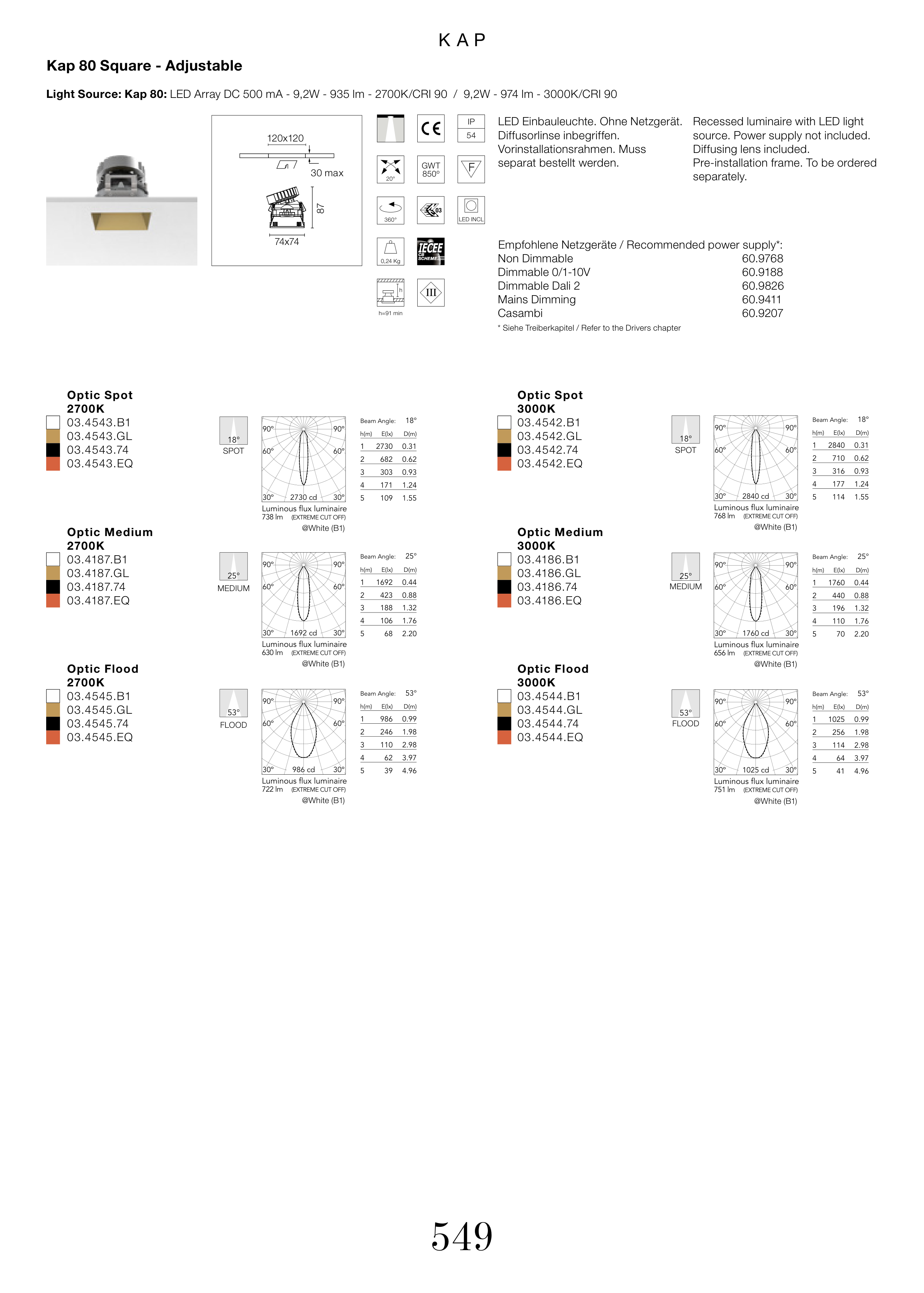 Light Source: Kap 80: LED Array DC 500 mA - 9,2W - 935 lm - 2700K/CRI 90 / 9,2W - 974 lm - 3000K/CRI 90