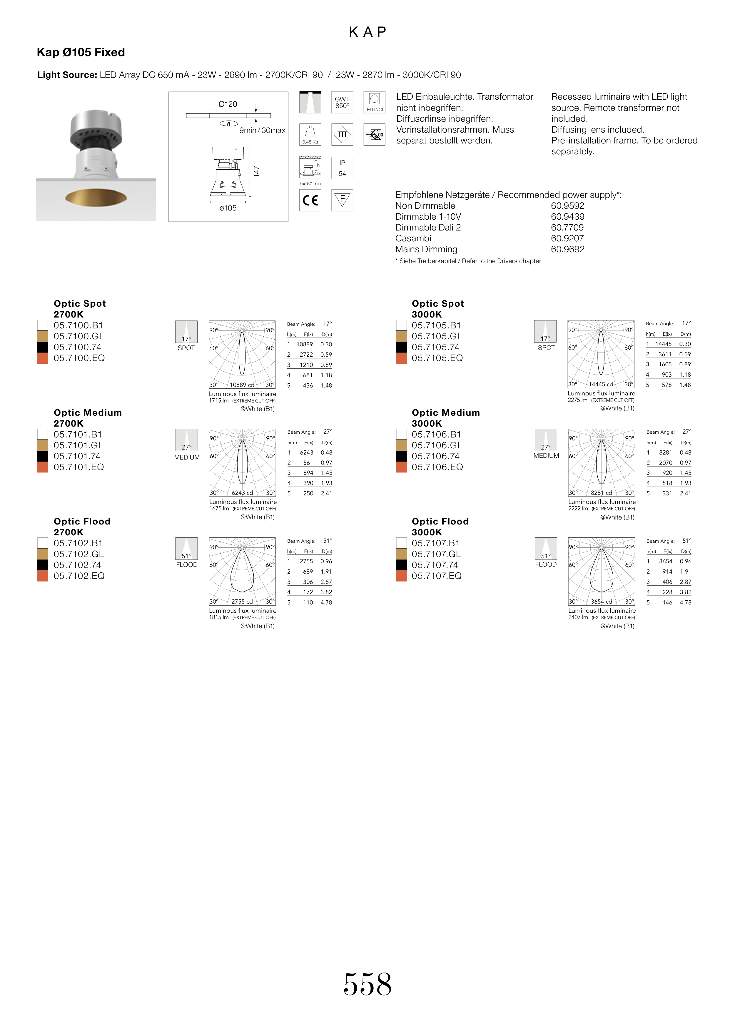 Light Source: LED Array DC 650 mA - 23W - 2690 lm - 2700K/CRI 90 / 23W - 2870 lm - 3000K/CRI 90