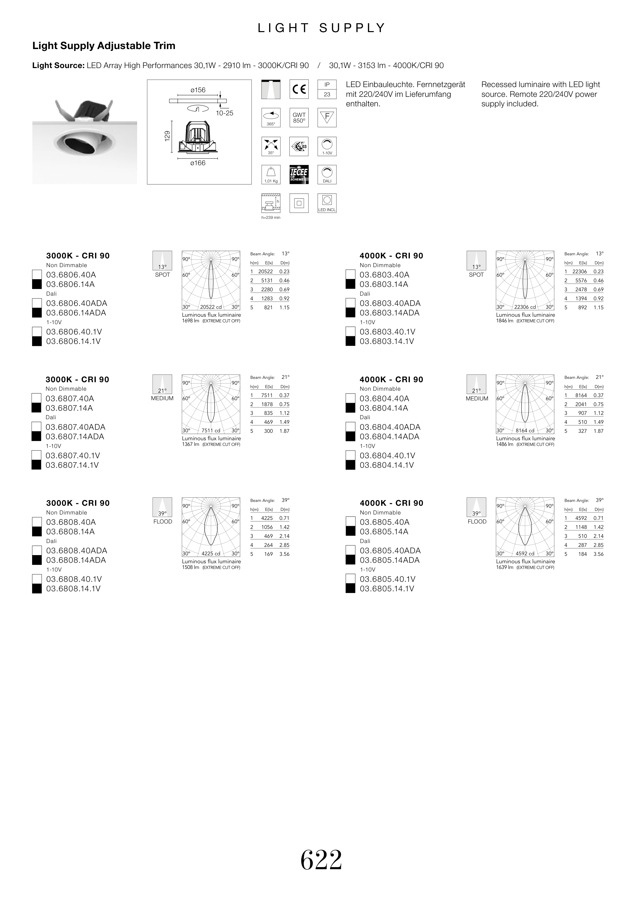 Light Source: LED Array High Performances 30,1W - 2910 lm - 3000K/CRI 90 / 30,1W - 3153 lm - 4000K/CRI 90