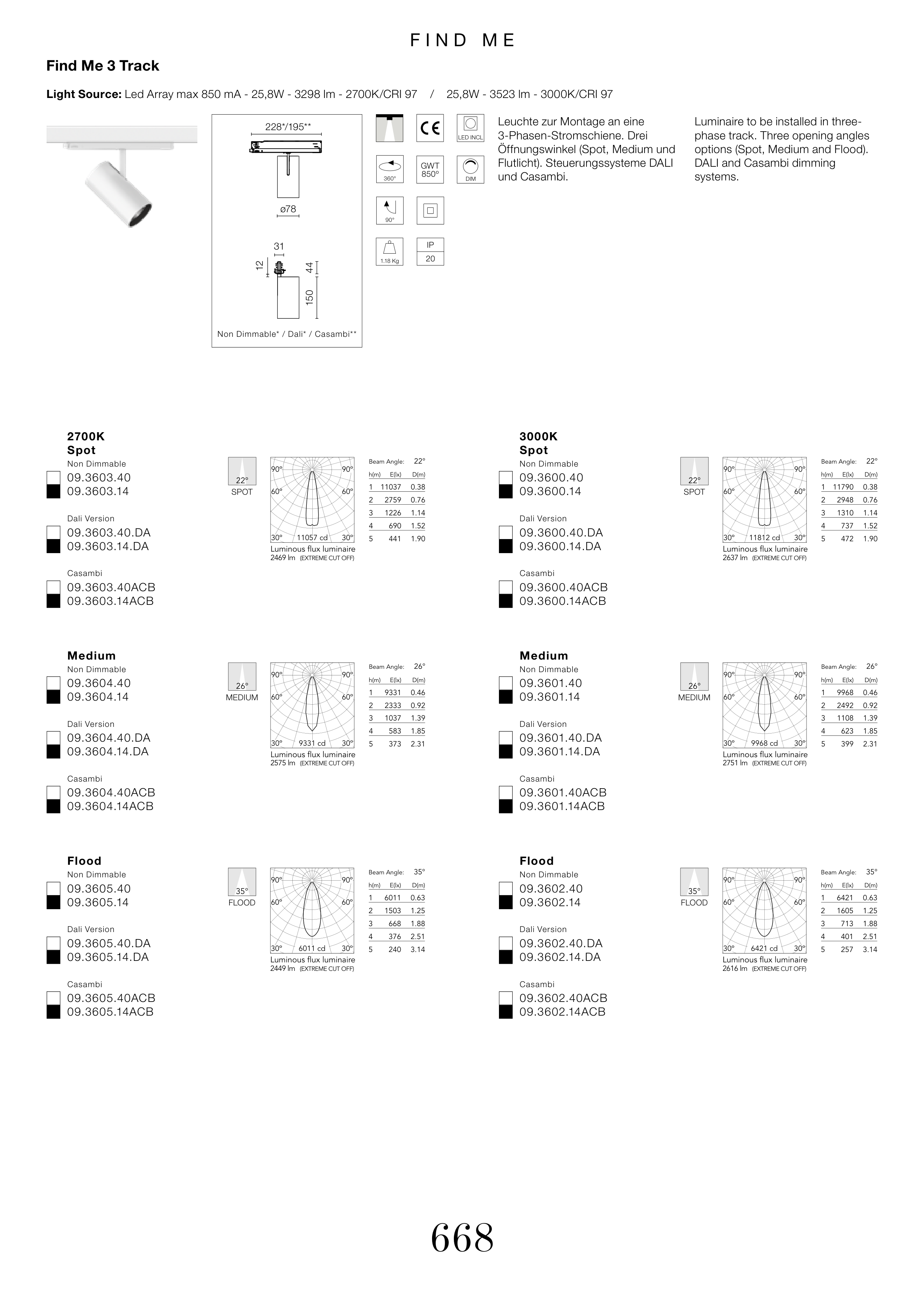 Light Source: Led Array max 850 mA - 25,8W - 3298 lm - 2700K/CRI 97 / 25,8W - 3523 lm - 3000K/CRI 97