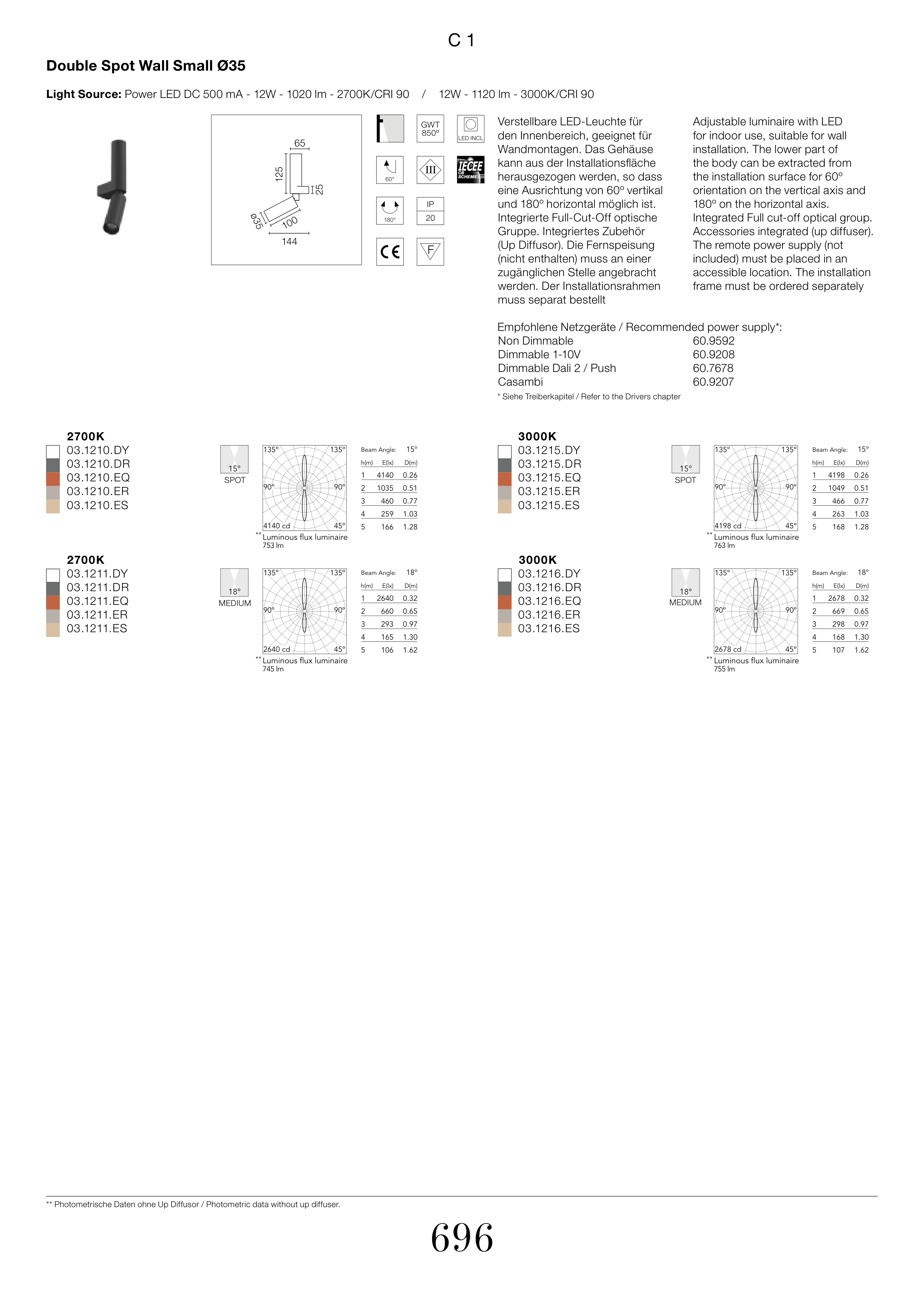 Light Source: Power LED DC 500 mA - 12W - 1020 lm - 2700K/CRI 90 / 12W - 1120 lm - 3000K/CRI 90