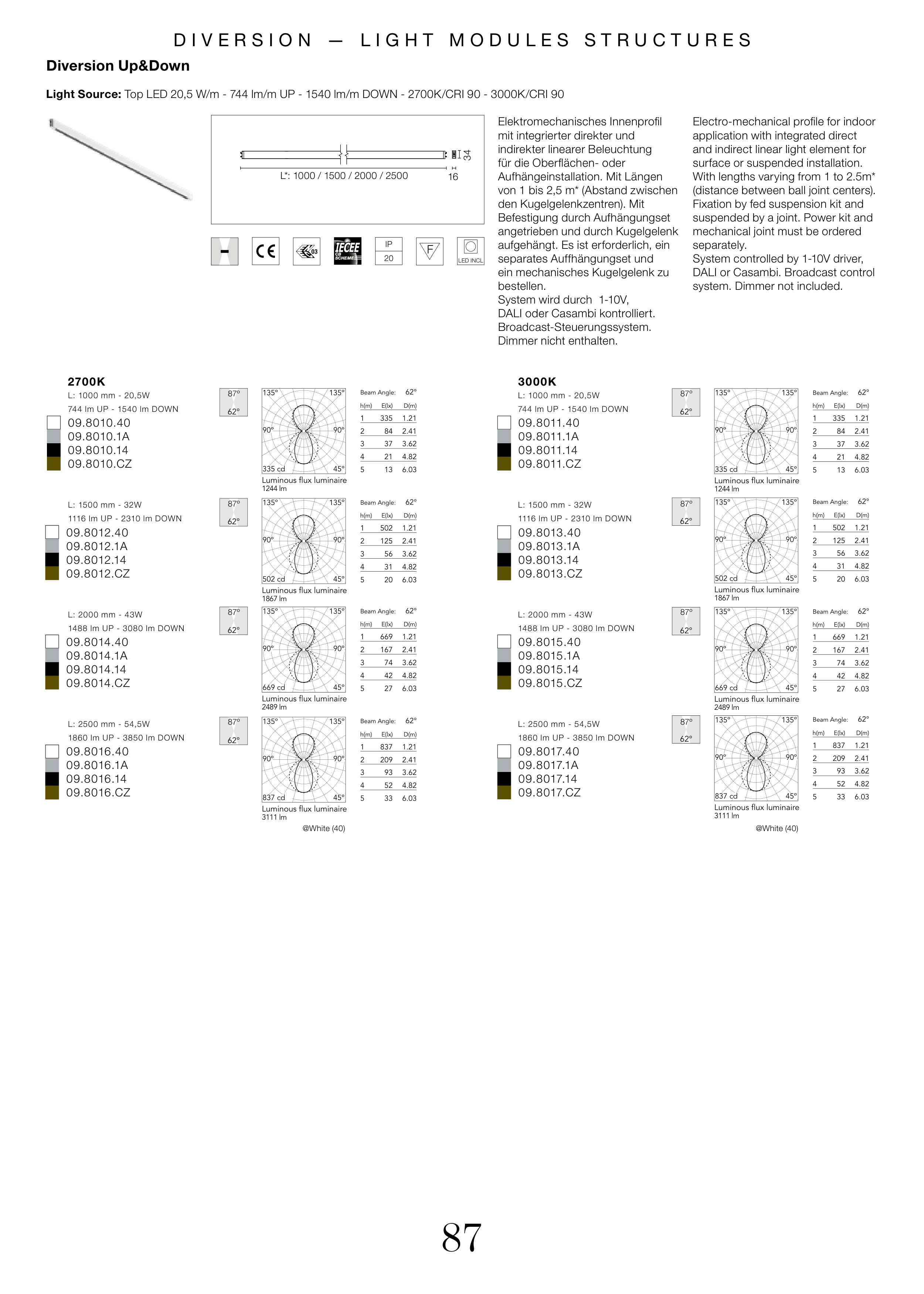 Light Source: Top LED 20,5 W/m - 744 lm/m UP - 1540 lm/m DOWN - 2700K/CRI 90 - 3000K/CRI 90