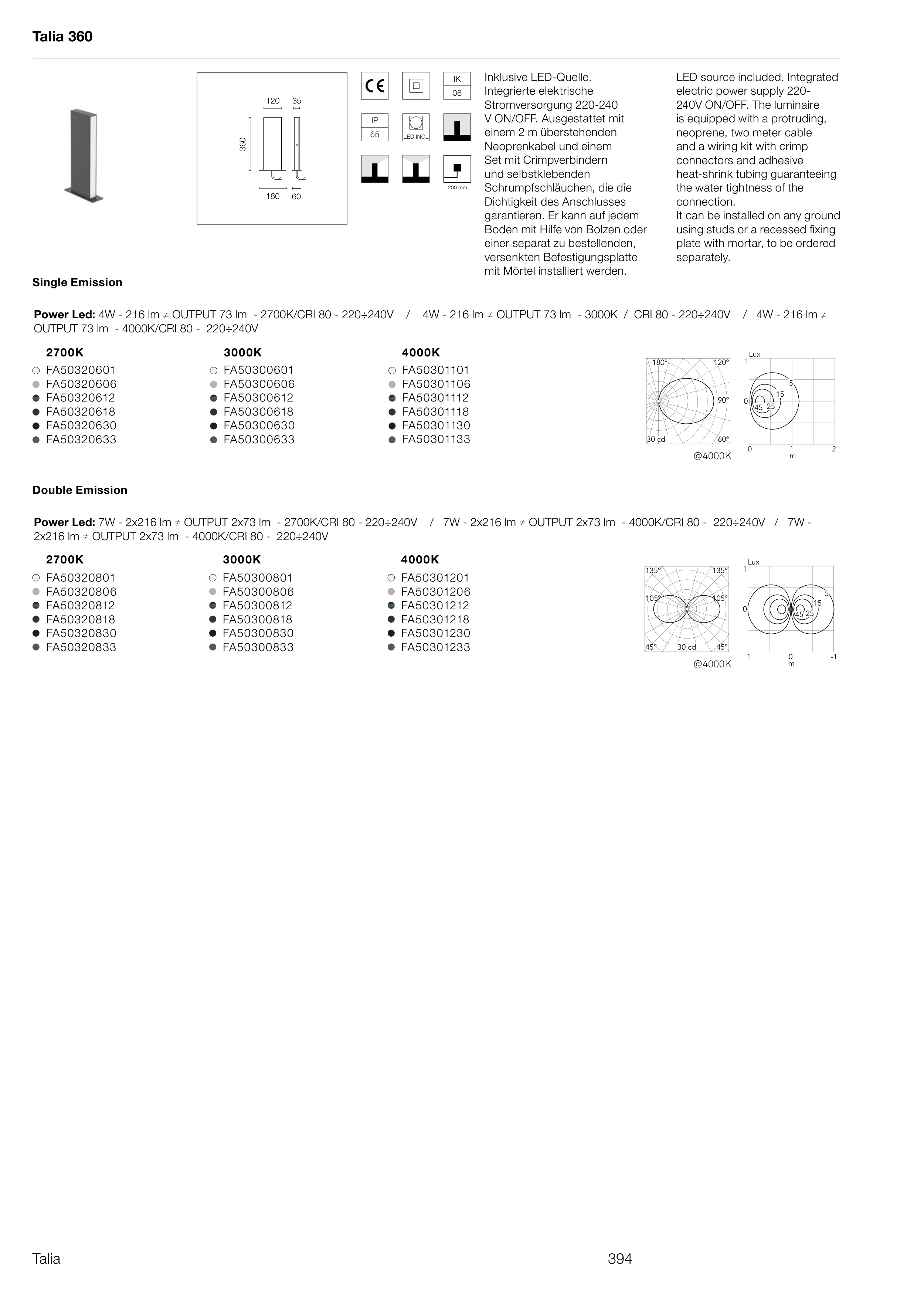 Power Led: 7W - 2x216 lm ≠ OUTPUT 2x73 lm - 2700K/CRI 80 - 220÷240V / 7W - 2x216 lm ≠ OUTPUT 2x73 lm - 4000K/CRI 80 - 220÷240V / 7W -