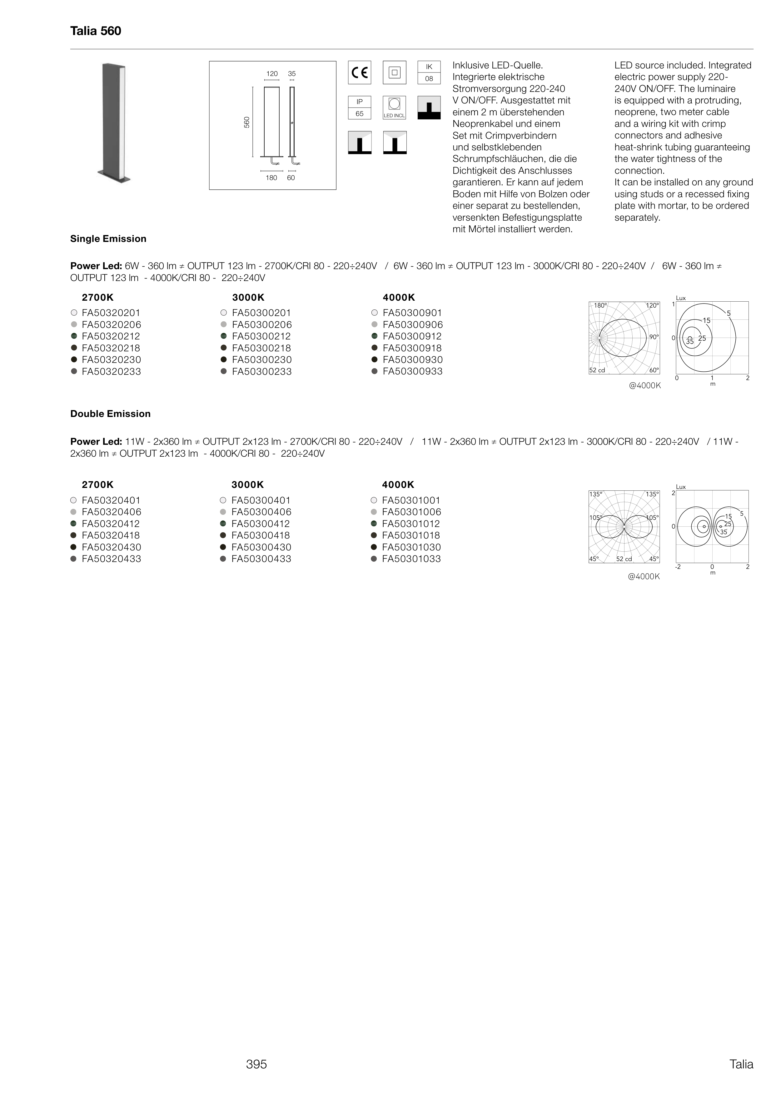 Power Led: 11W - 2x360 lm ≠ OUTPUT 2x123 lm - 2700K/CRI 80 - 220÷240V / 11W - 2x360 lm ≠ OUTPUT 2x123 lm - 3000K/CRI 80 - 220÷240V / 11W -