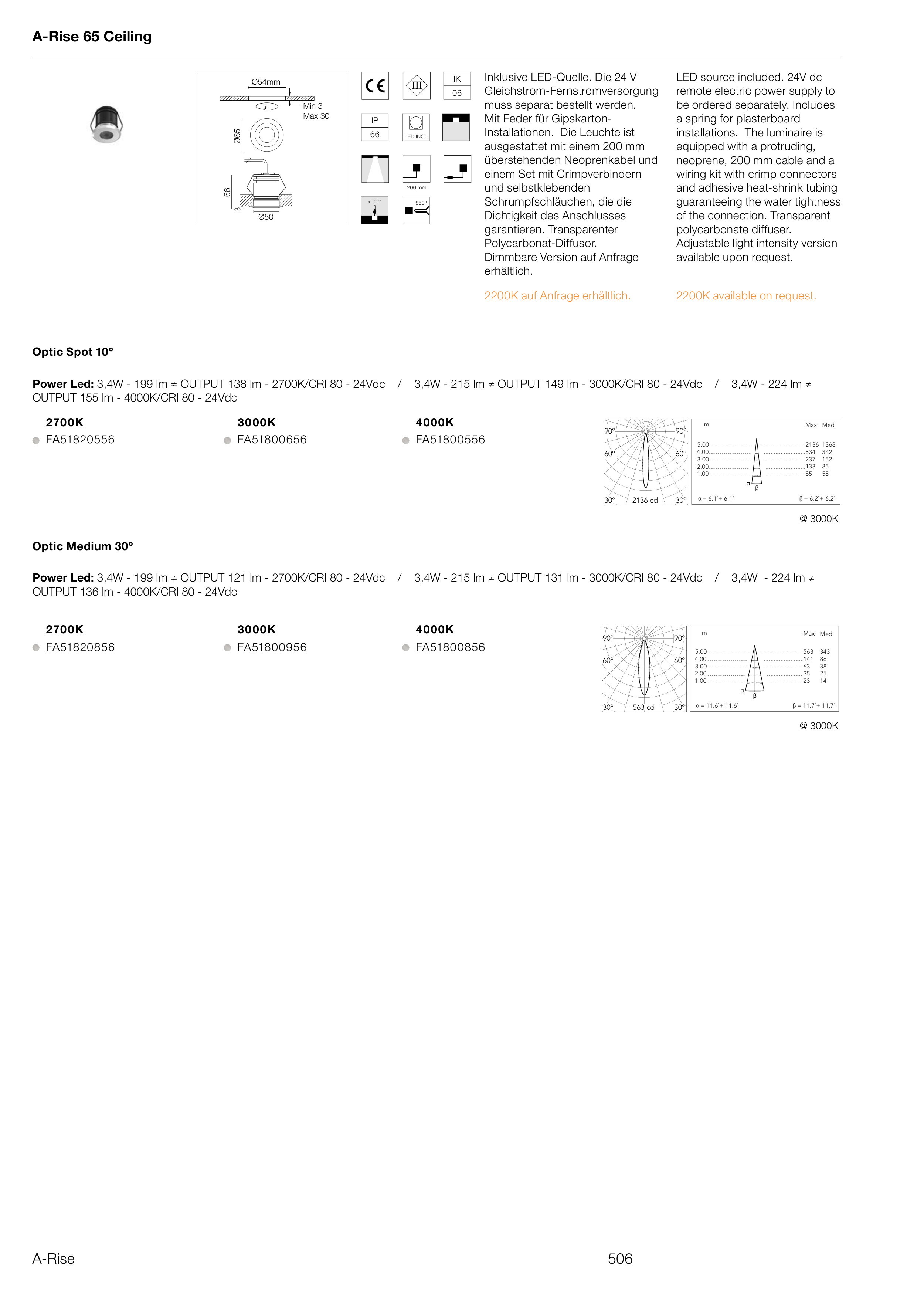 Power Led: 3,4W - 199 lm ≠ OUTPUT 121 lm - 2700K/CRI 80 - 24Vdc / 3,4W - 215 lm ≠ OUTPUT 131 lm - 3000K/CRI 80 - 24Vdc / 3,4W - 224 lm ≠