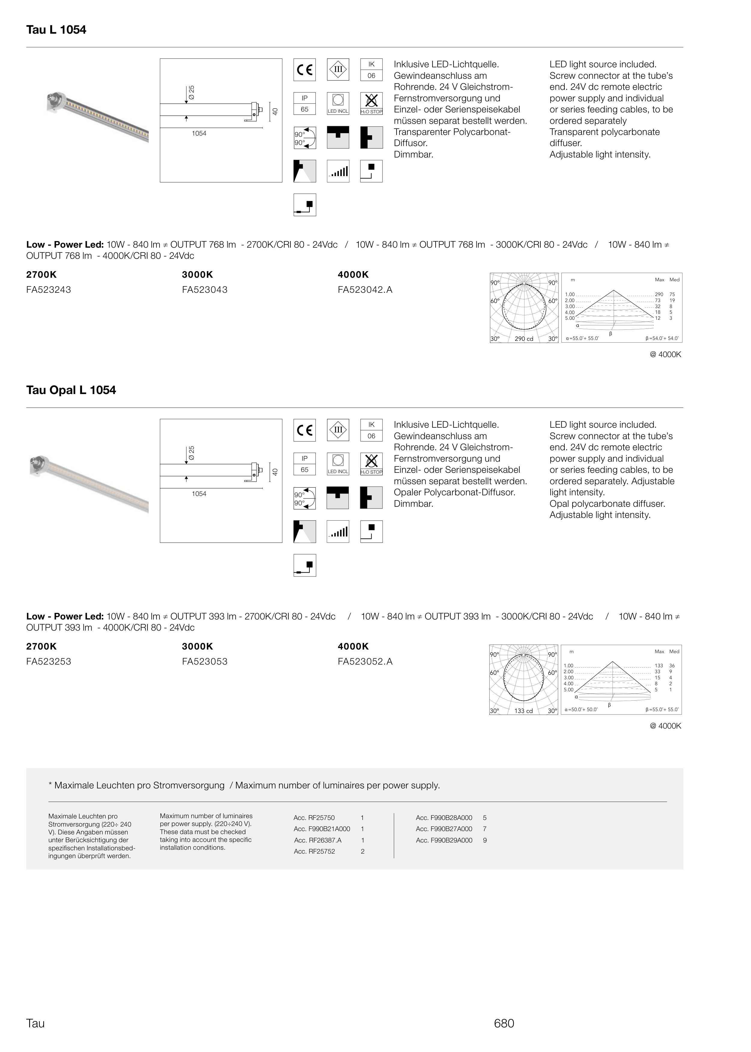 Low - Power Led: 10W - 840 lm ≠ OUTPUT 393 lm - 2700K/CRI 80 - 24Vdc / 10W - 840 lm ≠ OUTPUT 393 lm - 3000K/CRI 80 - 24Vdc / 10W - 840 lm ≠