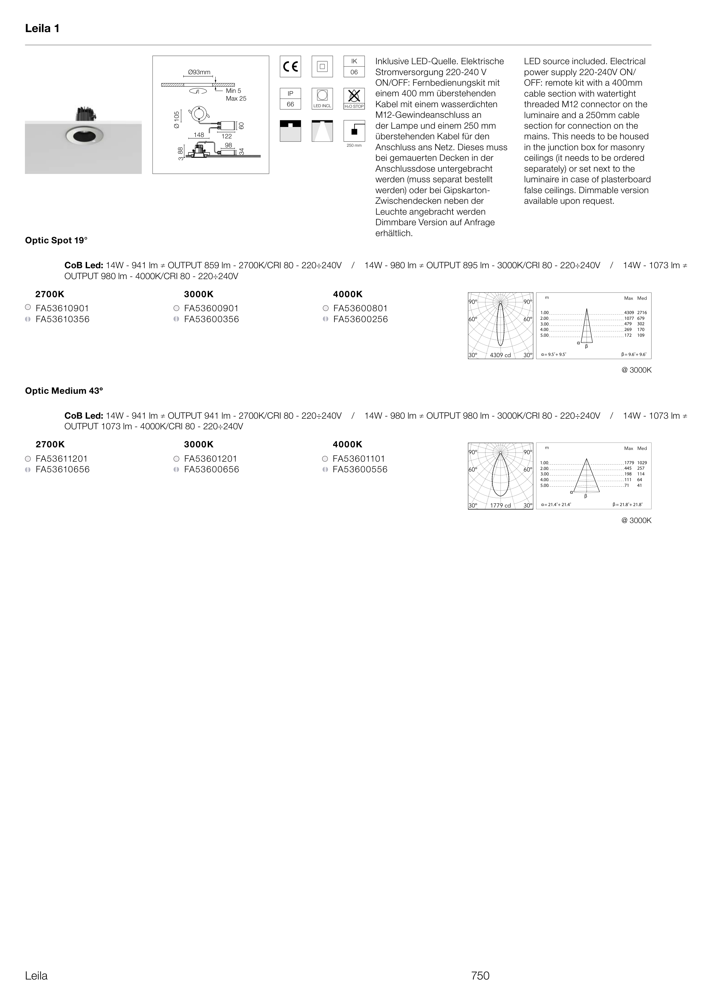 CoB Led: 14W - 941 lm ≠ OUTPUT 859 lm - 2700K/CRI 80 - 220÷240V / 14W - 980 lm ≠ OUTPUT 895 lm - 3000K/CRI 80 - 220÷240V / 14W - 1073 lm ≠