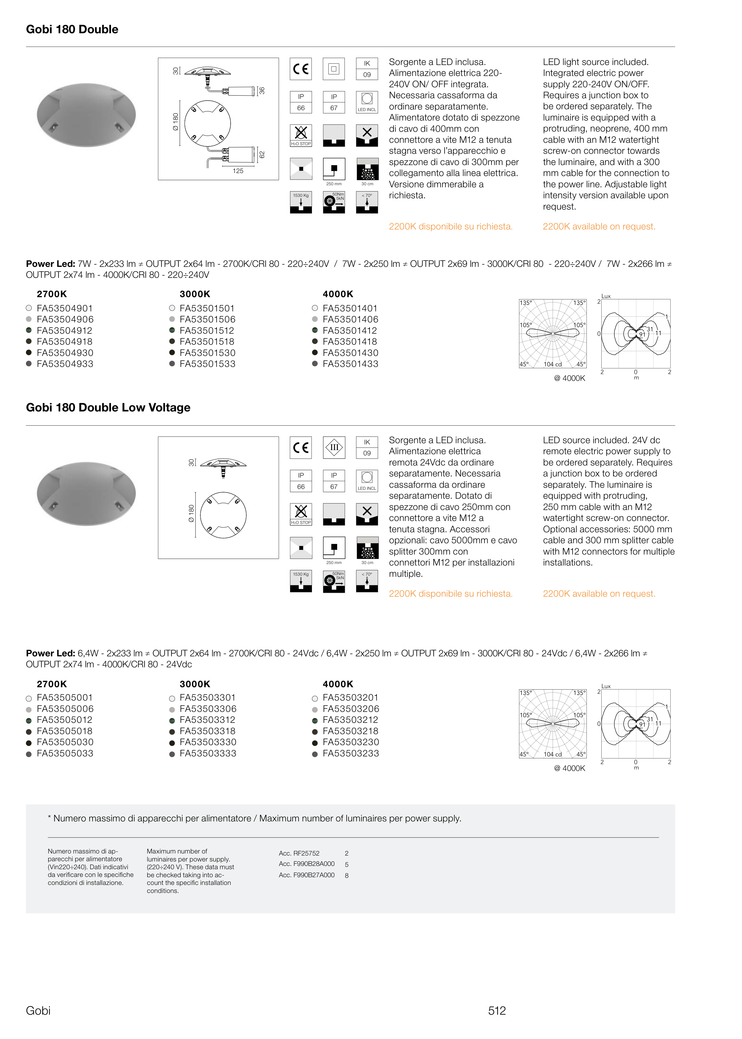 Power Led: 7W - 2x233 lm ≠ OUTPUT 2x64 lm - 2700K/CRI 80 - 220÷240V / 7W - 2x250 lm ≠ OUTPUT 2x69 lm - 3000K/CRI 80 - 220÷240V / 7W - 2x266 lm ≠
