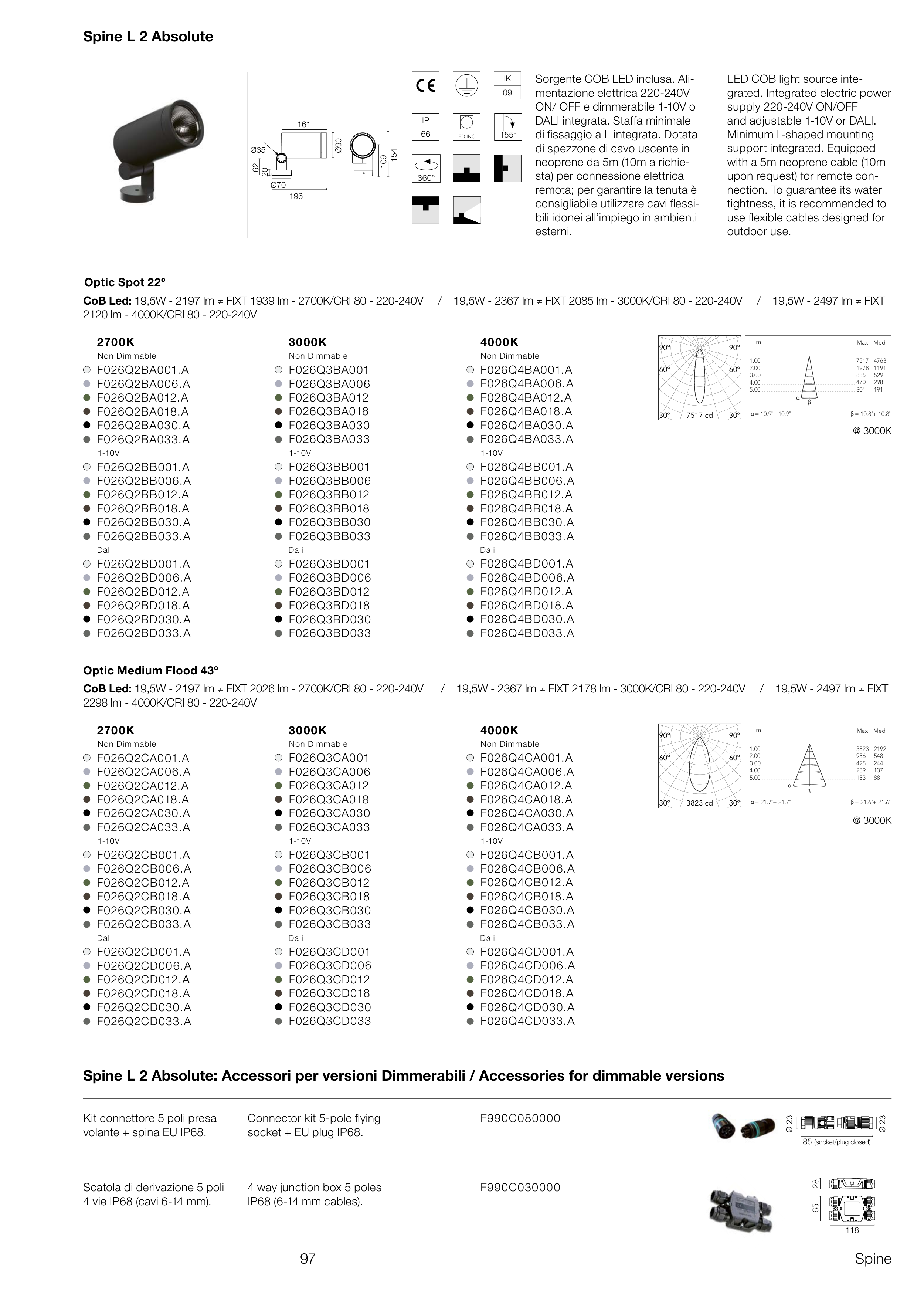 CoB Led: 19,5W - 2197 lm ≠ FIXT 1939 lm - 2700K/CRI 80 - 220-240V / 19,5W - 2367 lm ≠ FIXT 2085 lm - 3000K/CRI 80 - 220-240V / 19,5W - 2497 lm ≠ FIXT