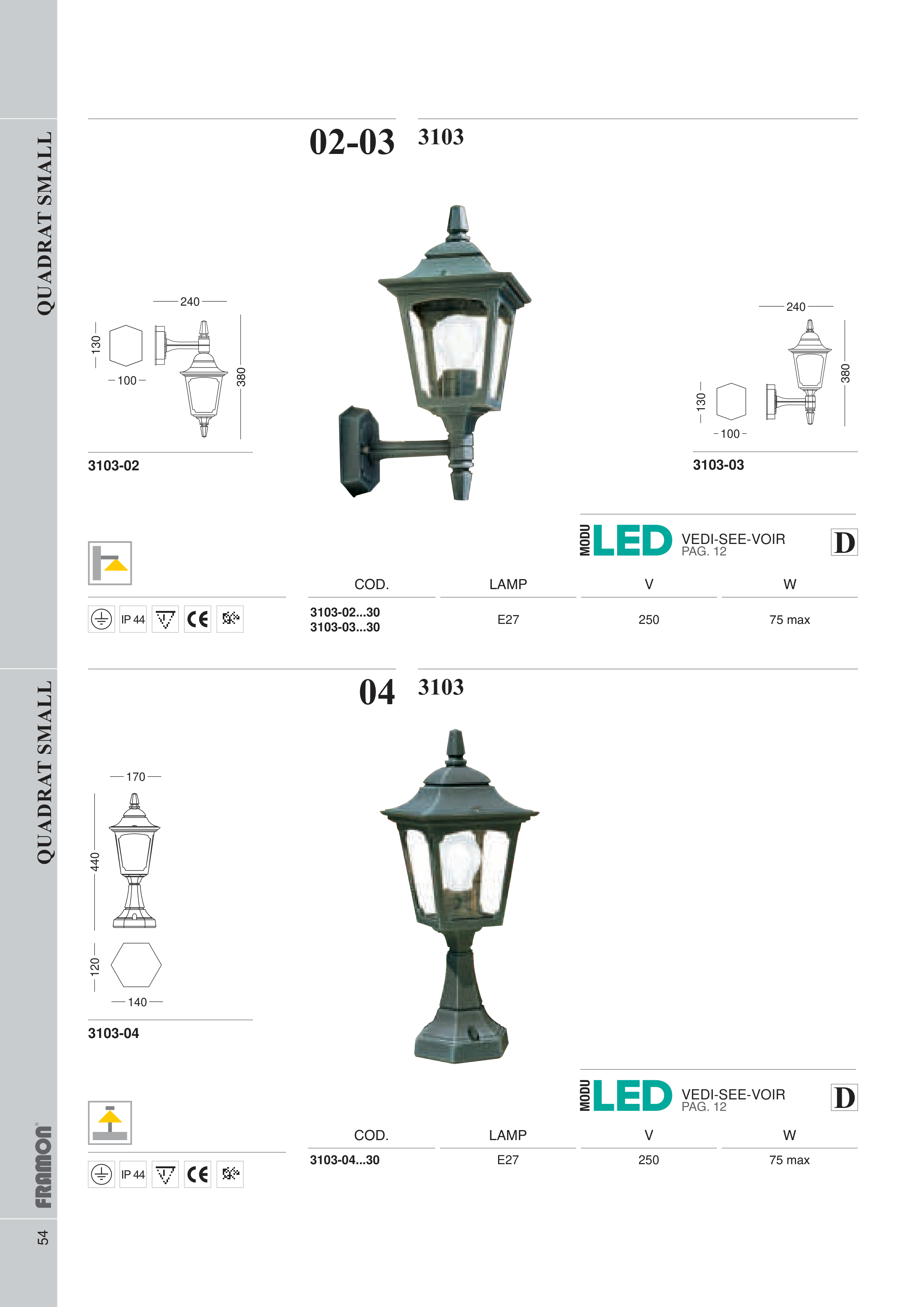 54 380 240 100 130 380 240 100 130 3103-03 3103-02 02-03 3103 COD. LAMP V W 3103-02...30 3103-03...30 E27 250 75 max IP 44 D VEDI-SEE-VOIR PAG. 12 04 3103 COD. LAMP V W 3103-04...30 E27 250 75 max IP 44 D VEDI-SEE-VOIR PAG. 12 440 170 140 120 3103-04 QUADRAT SMALL QUADRAT SMALL