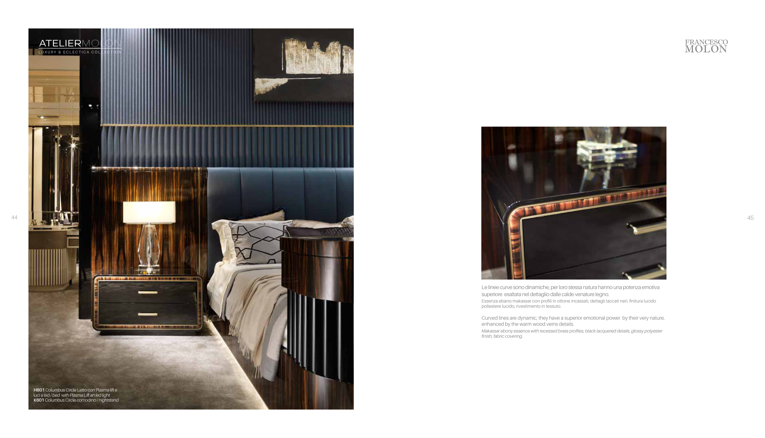 Makassar ebony essence with recessed brass profiles, black lacquered details, glossy polyester