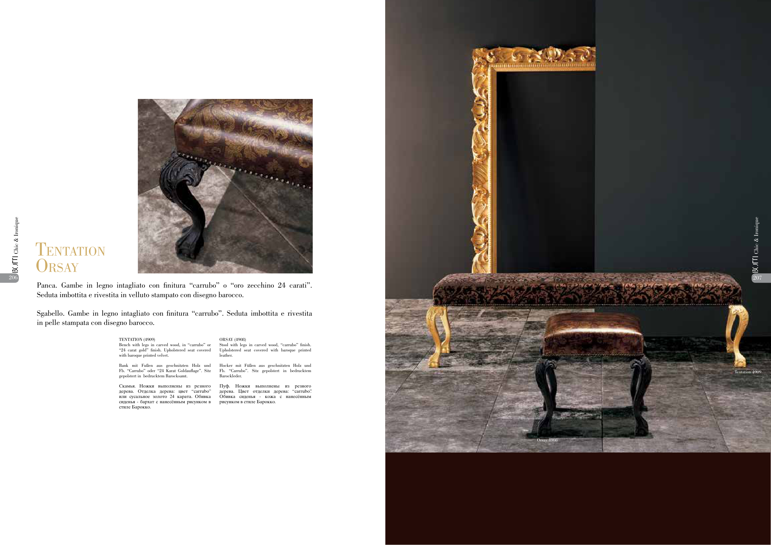 Panca. Gambe in legno intagliato con finitura “carrubo” o “oro zecchino 24 carati”.