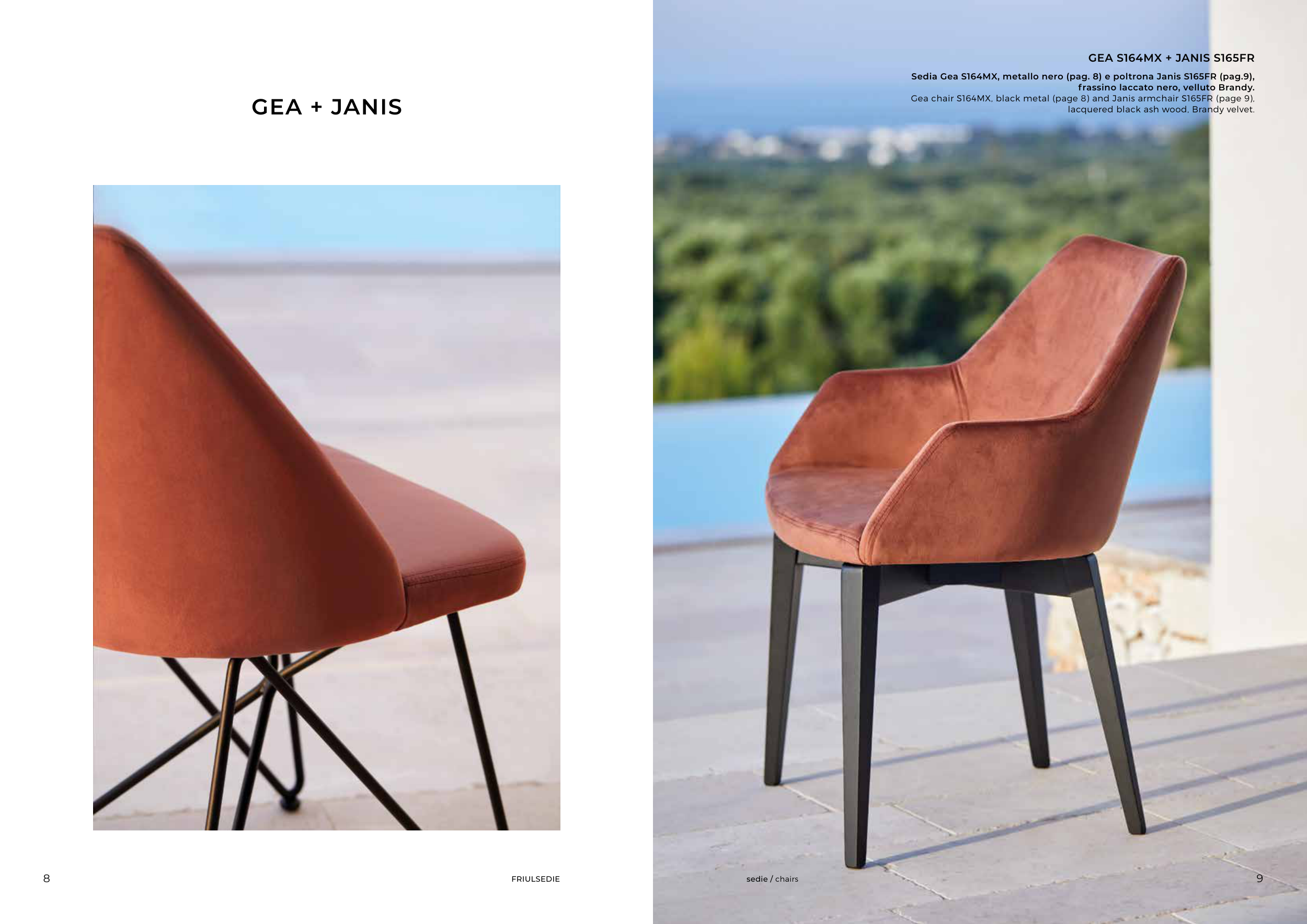 Gea chair S164MX, black metal (page 8) and Janis armchair S165FR (page 9),