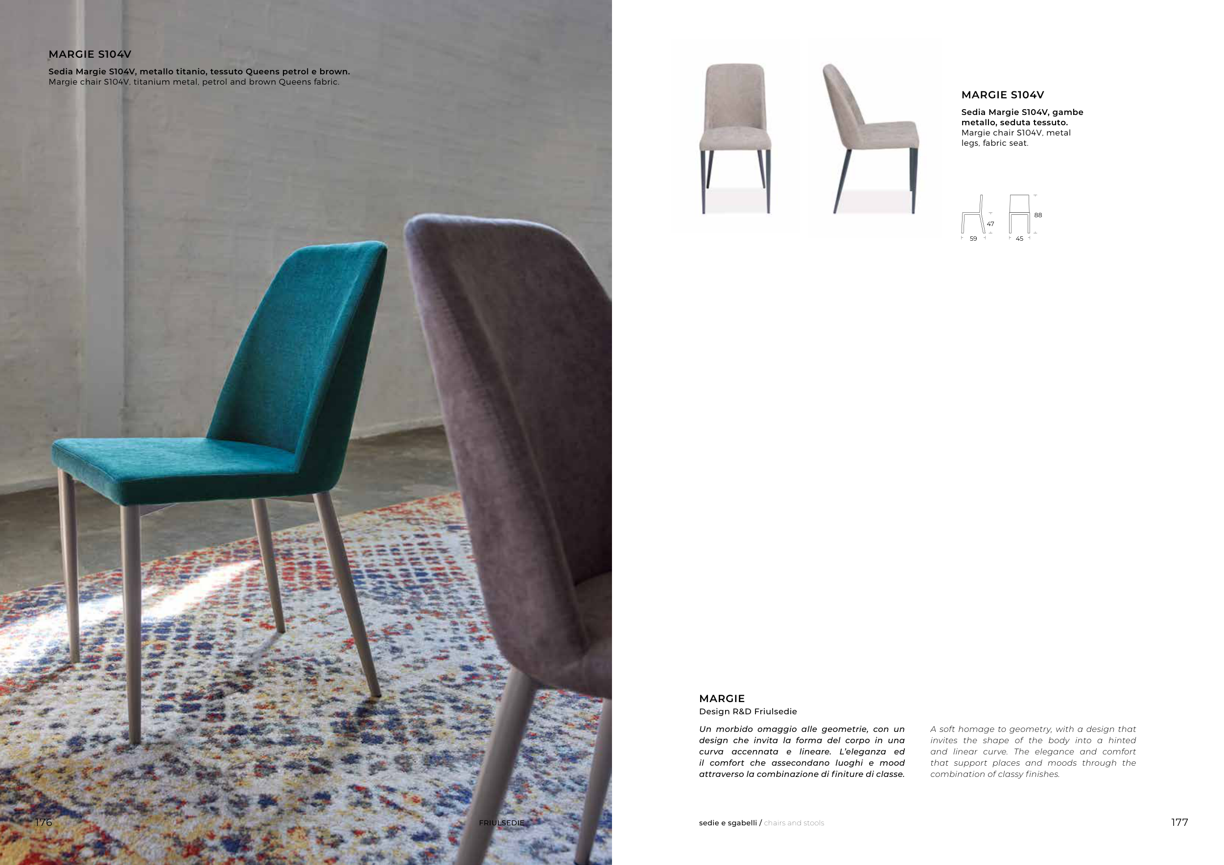Sedia Margie S104V, metallo titanio, tessuto Queens petrol e brown.