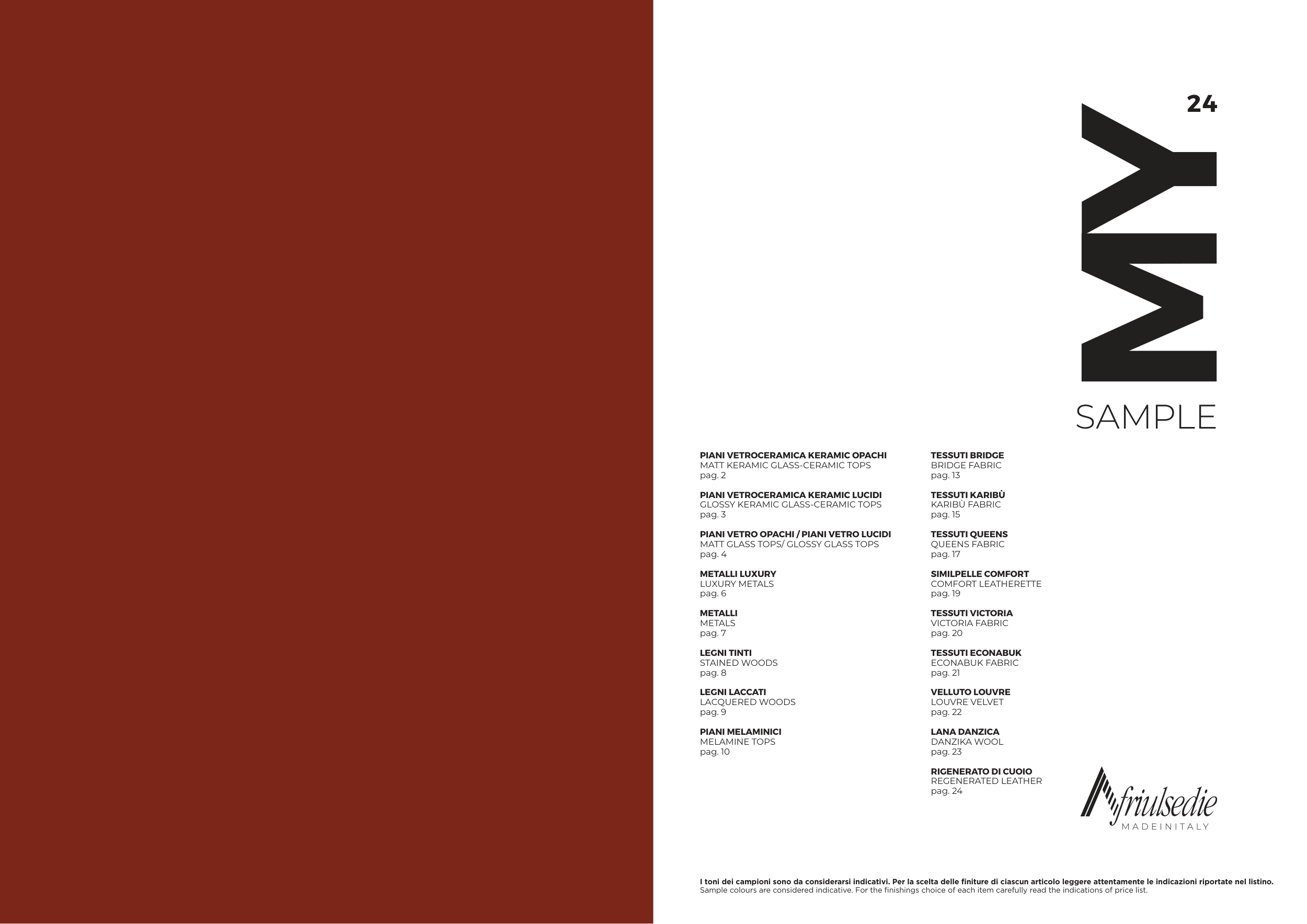 I toni dei campioni sono da considerarsi indicativi. Per la scelta delle finiture di ciascun articolo leggere attentamente le indicazioni riportate nel listino.