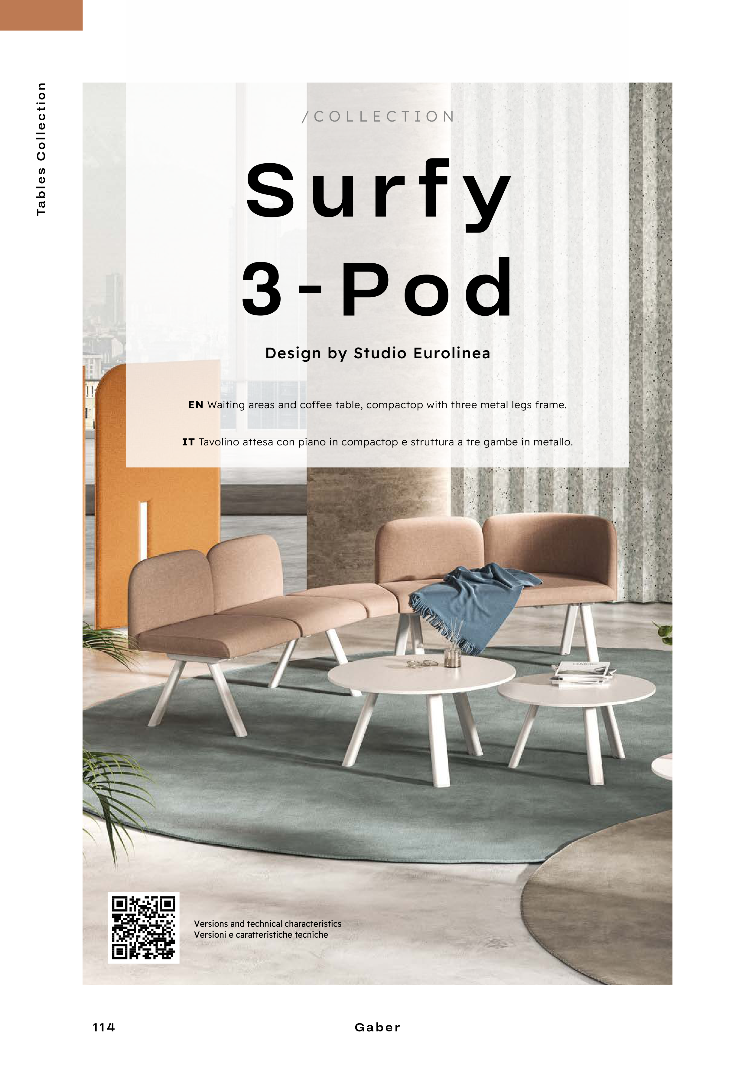 EN Waiting areas and coffee table, compactop with three metal legs frame.