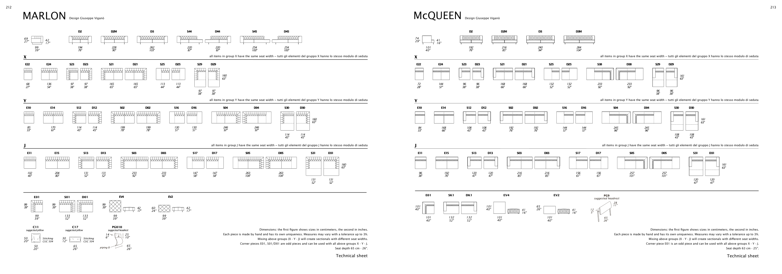 Mixing above groups (X - Y - J) will create sectionals with diferent seat widths.