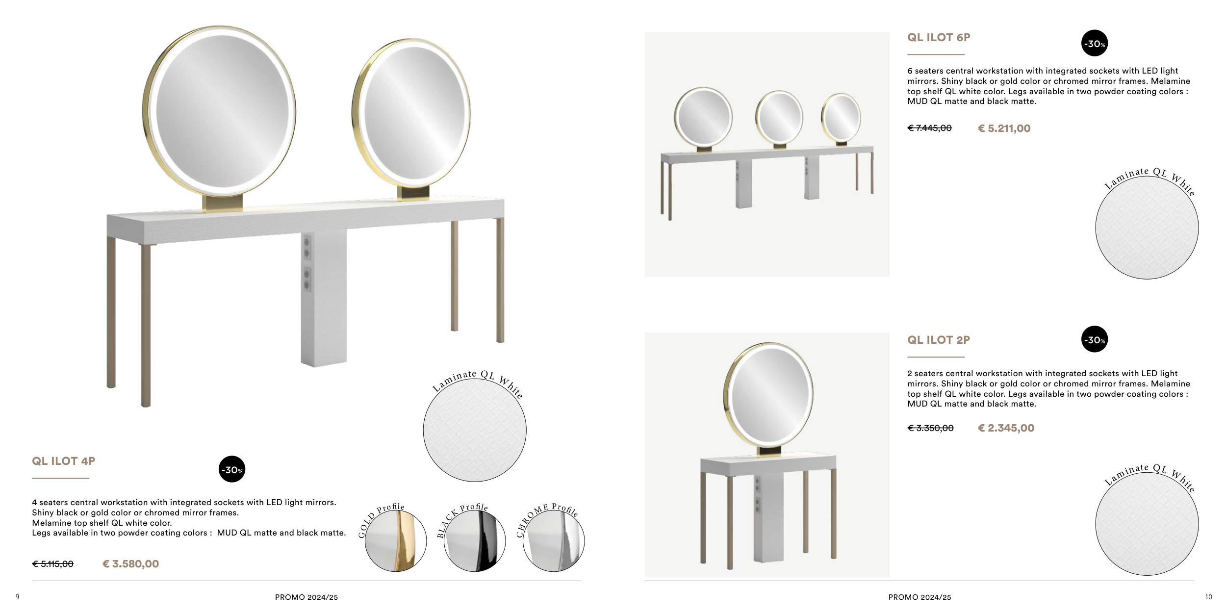 4 seaters central workstation with integrated sockets with LED light mirrors.