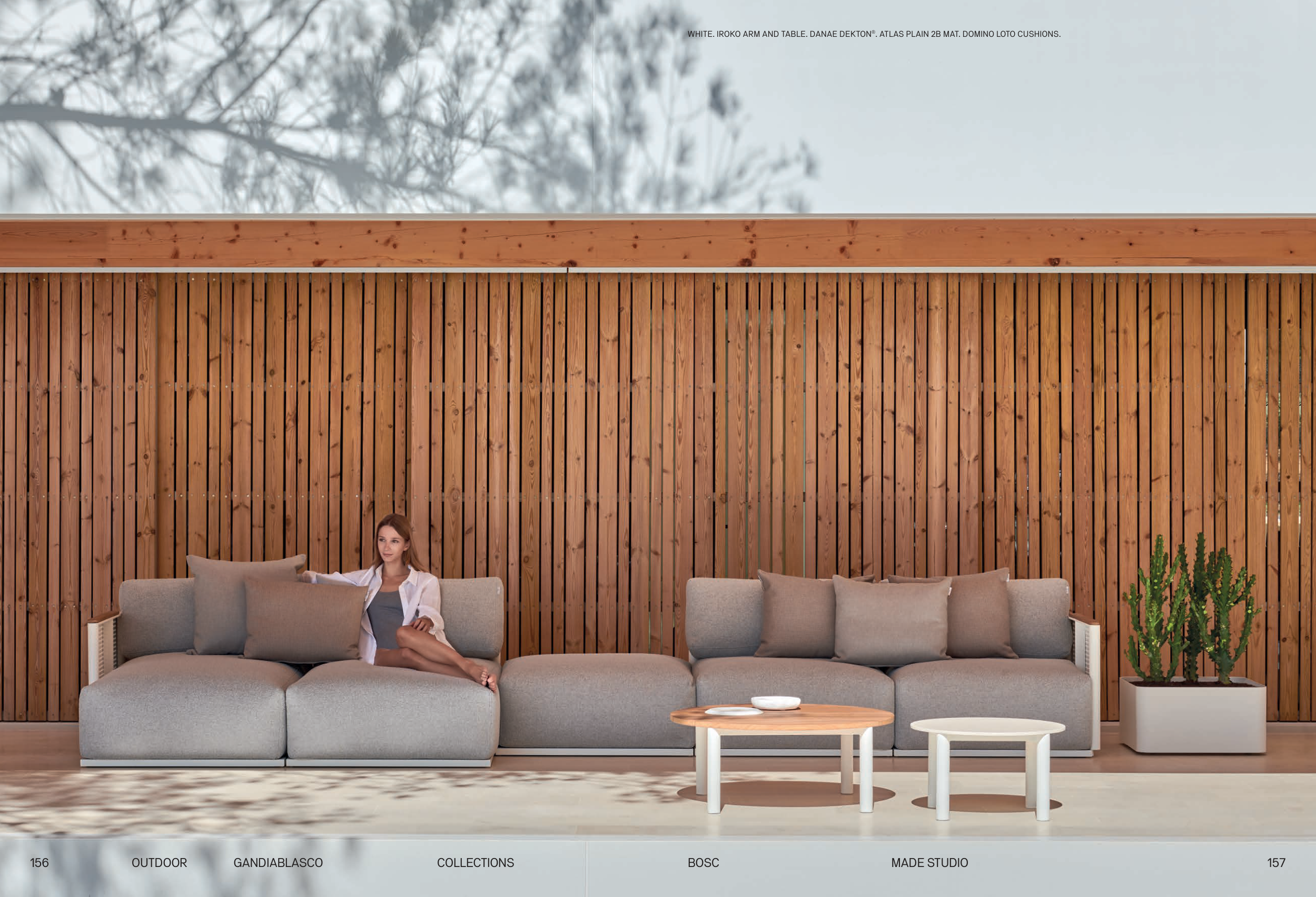 WHITE. IROKO ARM AND TABLE. DANAE DEKTON®. ATLAS PLAIN 2B MAT. DOMINO LOTO CUSHIONS.